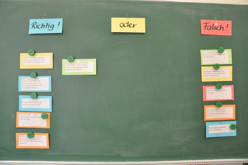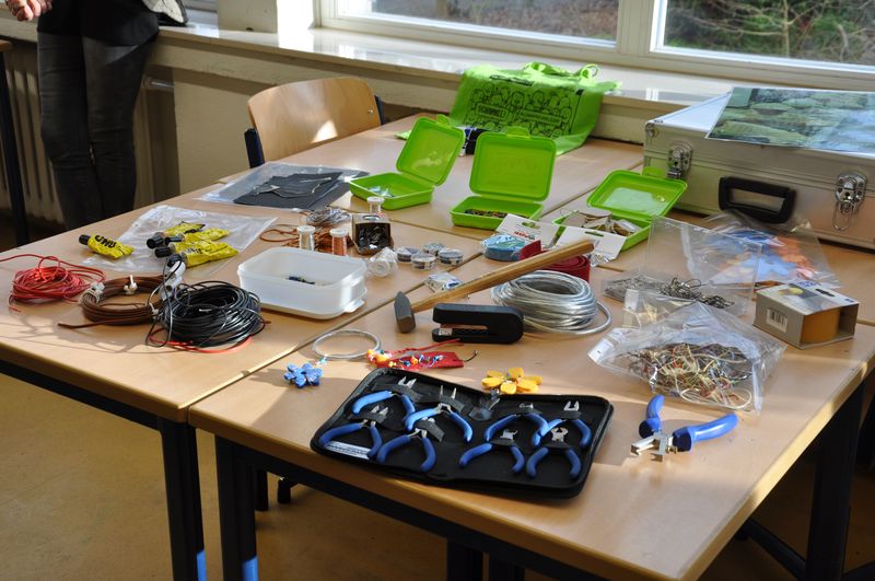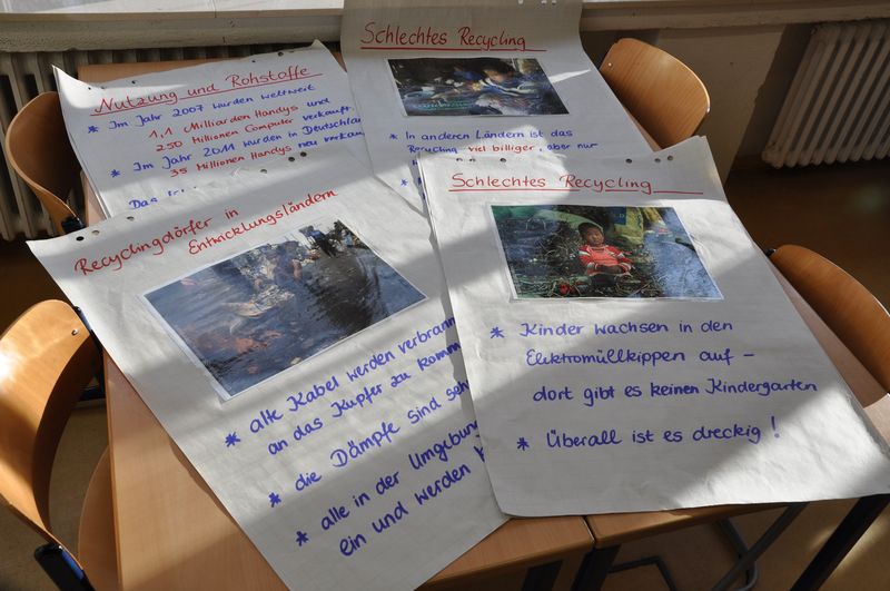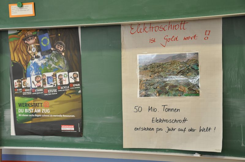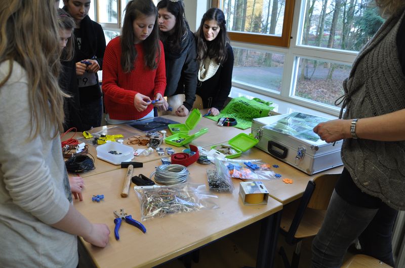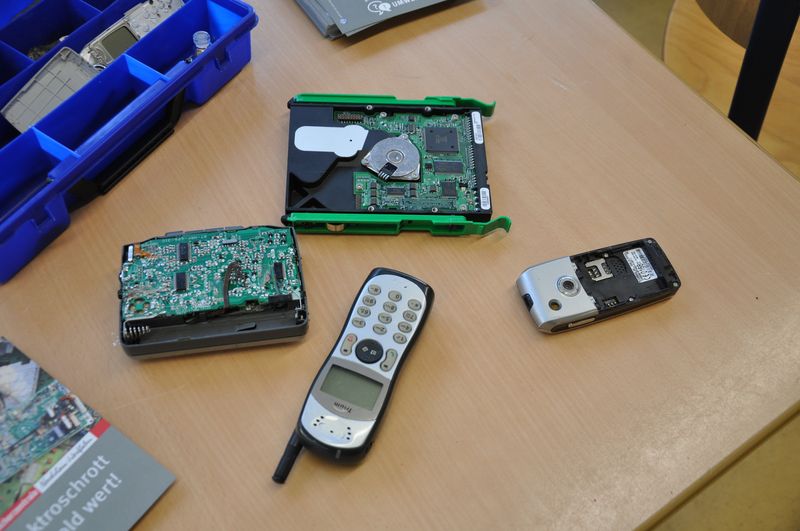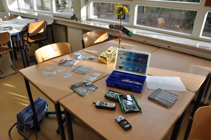 Elektroschrott kann Gold wert sein, das erlebten jetzt die Schüler der Natur & Kreativ-AG mit Frau Sundermeier. Zwei Damen der Verbraucherberatung MI-LK zeigten eindrucksvoll den Weg eines alten Elektrogerätes von der Rohstoffgewinnung bis zum Recycling. Mit Film- und Bildmaterial konnte die AG an einigen Stationen etwa die Gesundheits- und Umweltgefährdung bei der Herstellung von PC, Handy und Spielkonsole erarbeiten. Den Abschluß bildete die Herstellung eines individuellen Schmuckstückes aus Elektroschrott: Haarspangen, Lesezeichen, Broschen oder Deko-Objekte durfte jeder Teilnehmer aus einer großen Auswahl an Drähten, Metallteilen, Perlen und Kunststoffteilen gestalten.