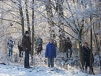 Bei einem Rundgang zwischen Schule, Biberteich und Kleiner Aue finden die AG-Schüler im Winter weitere interessante Dinge, die näher untersucht werden können: Eis (ob es schon trägt?) auf einem kleinen Teich und scheinbar "tierfreie" Uferränder. Dort sind allerdings Insekten, Spinnen und z. B. auch Amphibien in der Winterstarre und dürfen von uns nicht geweckt werden.