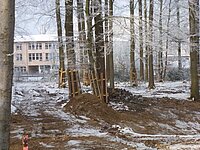 Am Biberteich selbst wird seit der Weihnachtspause wieder gearbeitet und die Arbeiten sind im Zeitplan. Eine Treppenstelle zum Keschern für alle Schülerinnen und Schüler ist bereits fertig und Wege, neuer Bachlauf, Stein-Übergang und Böschungen sind in der Planung. Zum Schutz vor Bagger und Raupe wurden die Bäume mit einem Holzgerüst verpackt.
