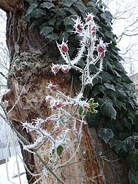 An der alten Schulgarten-Eiche sind die Hagebutten der englischen Rambler-Rose ein eisiges Kunstwerk geworden. Von den Vögeln noch unentdeckt bleiben sie in ihrem weißen Panzer und erfreuen alle Fotografen.