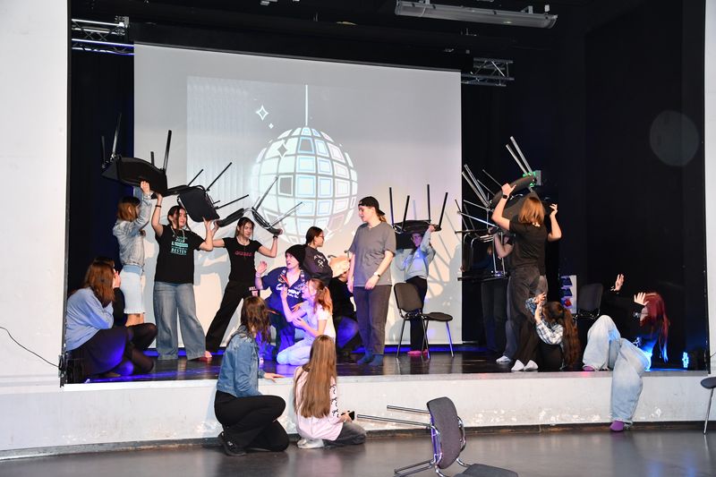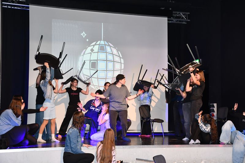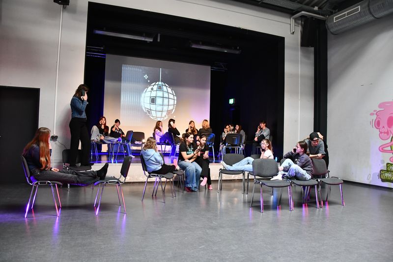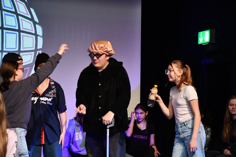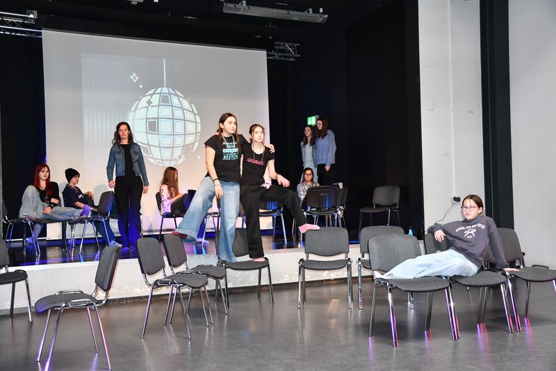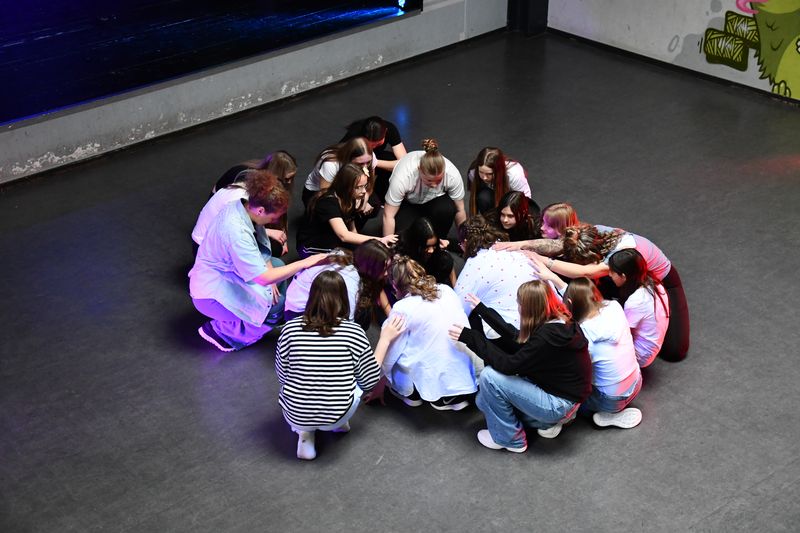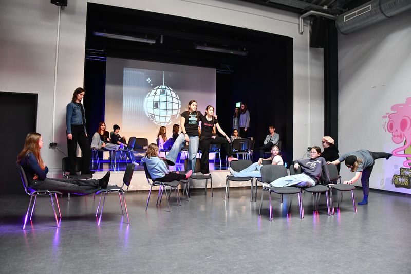 Unter der Leitung von Zoé Marie Pape aus Hamburg spielte die Theatergruppe das Stück „Party feiern“. Darin geht es um Jugendliche, die sich zu einer Party verabreden, dann aber, kaum dort angekommen, feststellen müssen, dass der Abend sie total langweilt. Die einen lästern über einen Jungen, den sie für äußerst seltsam halten. Die anderen überlegen, was sie anstelle der Party tun sollen, um ihrer Langeweile zu entfliehen. Auch sie können es nicht lassen, über einige Mädchen in der Gruppe herzuziehen, nur weil deren Outfit ihnen nicht gefällt. Die Situation eskaliert, es kommt zum Streit. Auf dessen Höhepunkt stellen alle plötzlich fest, dass die Party eine Geburtstagsfeier ist. Sofort beruhigen sich alle, die Glückwünsche lösen den Streit auf. Die Moral? Nicht Bildung von Grüppchen und die damit verbundenen Dynamiken, nicht Egoismen oder Fragen des persönlichen Geschmacks sind wichtig, sondern es kommt darauf an, sich selbst gemeinsam mit anderen den Raum zu geben, den es braucht, um friedlich und fröhlich miteinander umzugehen.