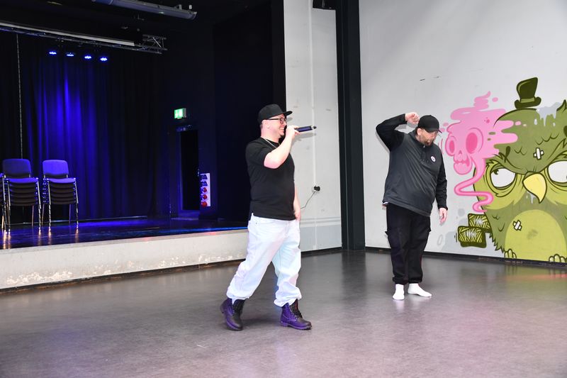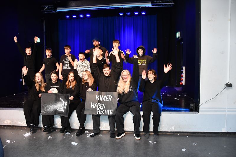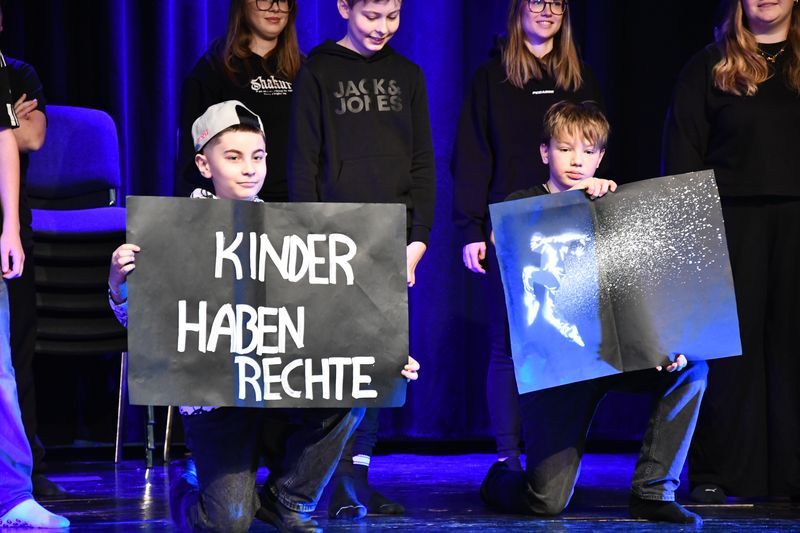 Daniel Schneider von Rapschool NRW hatte mit der Rap-Gruppe eine Woche lang intensiv gearbeitet. Mit ihren selbsterdachten Texten „Kinder haben Rechte, das steht fest“, „Regeln sind Linien, ich mach mir meine Welt“ und „Das Leben – unser Alltag“ erstellten die Schülerinnen, Schüler und Studierenden ein lyrisch anspruchsvolles Bild ihrer eigenen Welt. Verse wie „Schule ist wichtig, sie will uns was geben, wir wollen nicht unter Brücken leben“, „Nur wegen Meinung fällt ein Schuss. Das ist nicht richtig! Damit ist Schluss!“ oder „Ich hör‘ auf mein Herz, was mir wirklich nicht gefällt“ zeigten, wie reif und mitfühlend Kinder und junge Erwachsene empfinden; was sie bewegt, was sie sich wünschen und was ihrer Ansicht nach gar nicht geht. „Ich nehm mir Raum, ich nehm mir Zeit, auch wenn das Leben mich oft zerreißt“ zeugte von einer Haltung, sich niemals unterkriegen zu lassen, egal wie oft einem Steine in den Weg gelegt werden. Das Publikum belohnte die Darbietungen mit begeistertem Applaus.