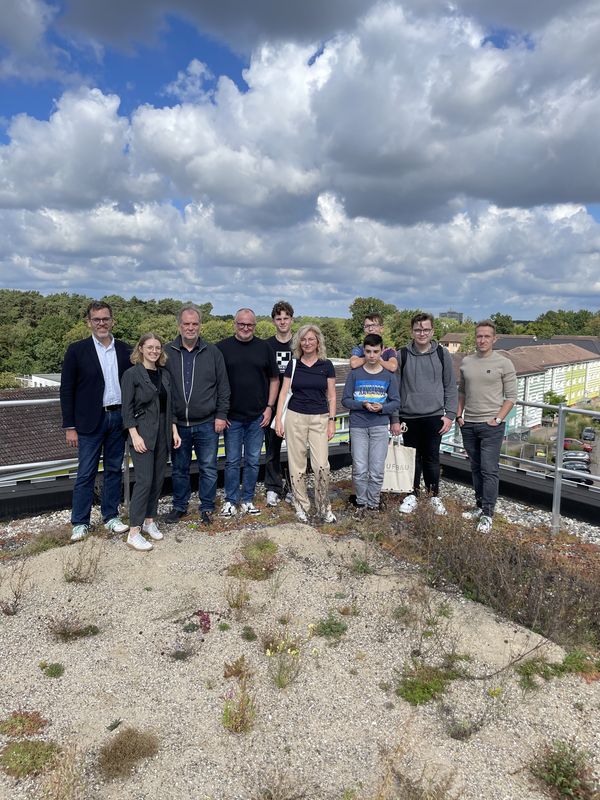 Hier sollen die Messstationen installiert werden: Die Projektpartner Sascha Golnik und Jennifer Epp (Aufbaugemeinschaft Espelkamp), Bernd Selig (OWL Robotics, Rudi Mantler und Noah Dyck (Codefryx), Anja Buhrmann und Viktor Kröker (Birger-Forell-Sekundarschule) besichtigen das begrünte Dach gemeinsam mit drei Stipendiaten.