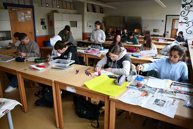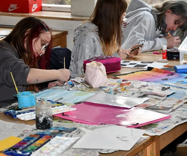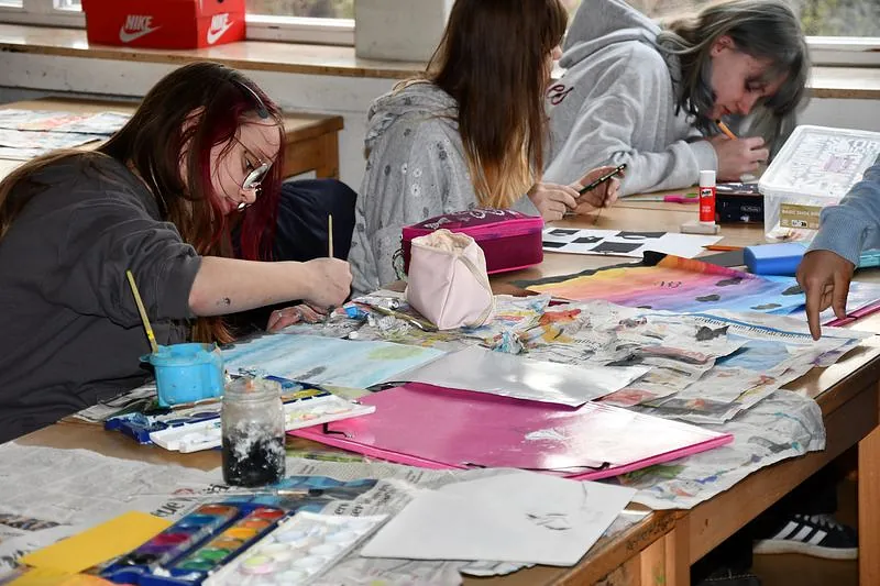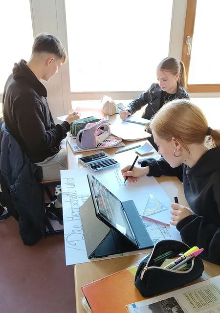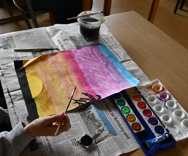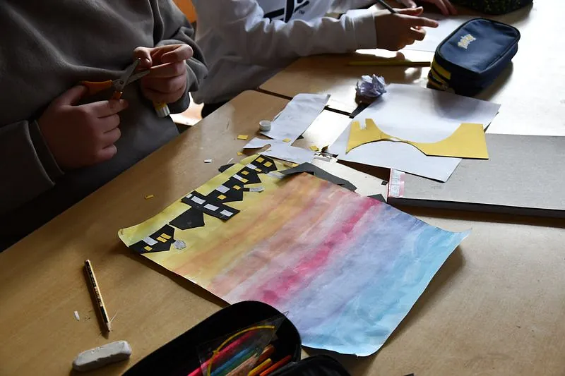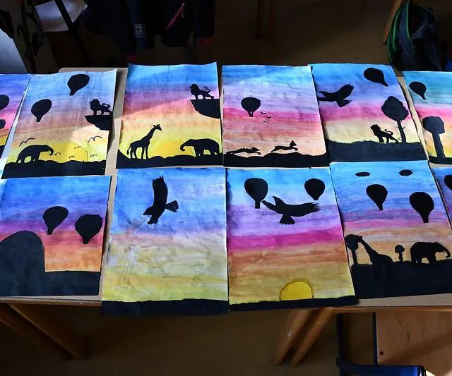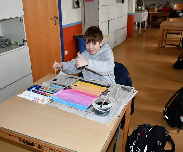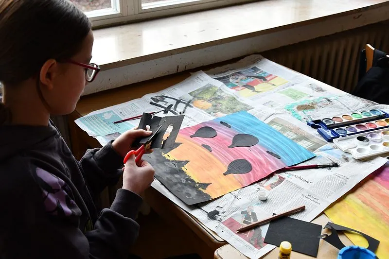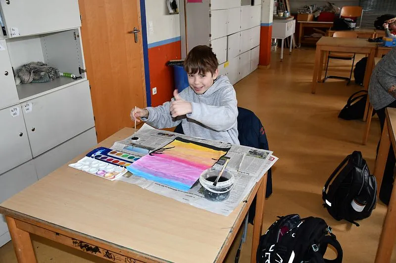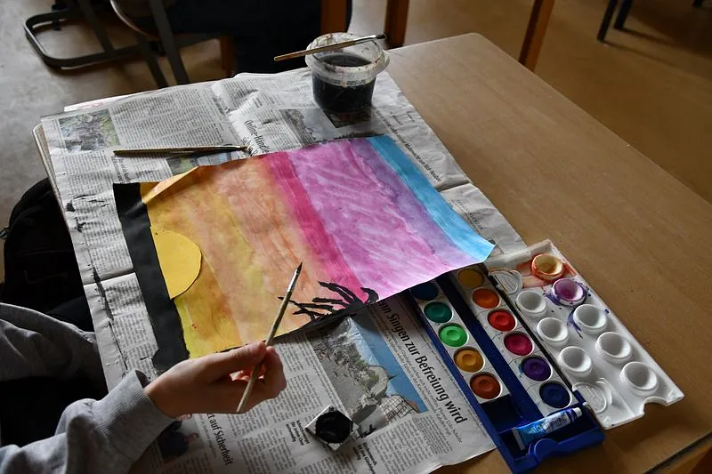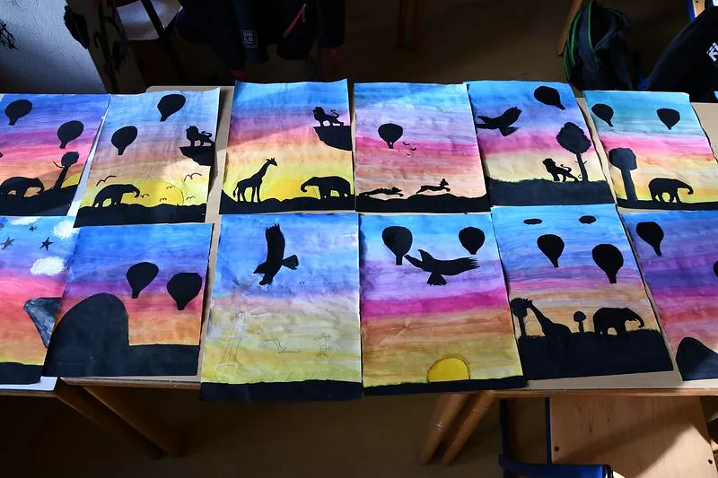 März 2026 Die Klasse 6c erstellt im Kunstunterricht gerade Bilder unter dem Thema Farbverlauf. Dazu haben die Kinder schwarze Scherenschnitte am Computer gemacht und gestalten bunte Sonnenuntergänge als Hintergrund. Dabei lassen sie die verwendeten Farben so verlaufen, dass sie fließend ineinander übergehen. Die verwendeten Primärfarben sind magenta-rot, cyan-blau und gelb. Die Schülerinnen und Schüler mischen sich daraus die Sekundärfarben, die sie für ihre Bilder benötigen. Das Verblenden der Farben ist nicht immer ganz einfach, aber in allen Fällen gelingt es am Ende sehr gut. Dabei kommt der Spaßfaktor nicht zu kurz.