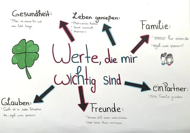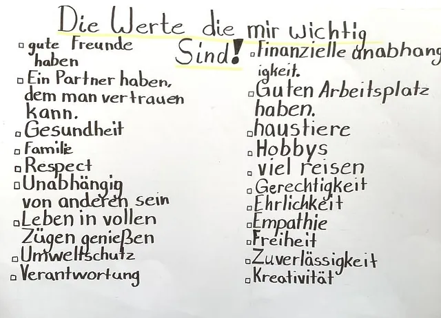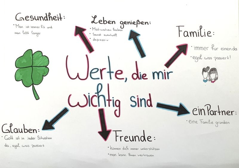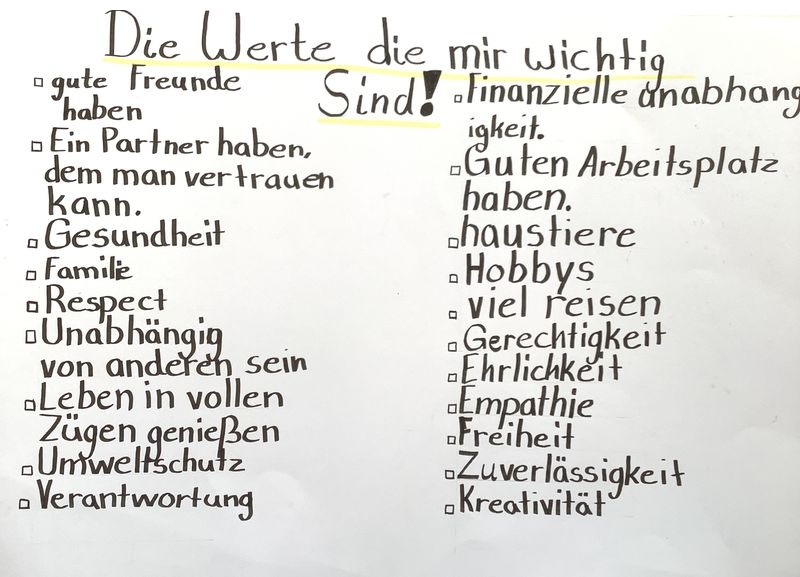 Dezember 2025 Die Klasse 9b hat in der Unterrichtsreihe "Mein Leben - dein Leben" im Fach Gesellschaftslehre überlegt, welche Werte in der heutigen Zeit wichtig sind. Dabei kamen ganz unterschiedliche Ergebnisse heraus. Gerade in einer Zeit, die von Dauerkrisen gebeutelt scheint, haben die Schülerinnen und Schüler mit ihren Gedanken deutlich gemacht, dass Werte zu haben ihnen Halt und Richtung geben kann. Das ist sehr erfreulich. Prima gemacht!
