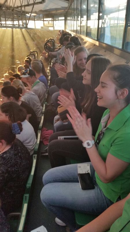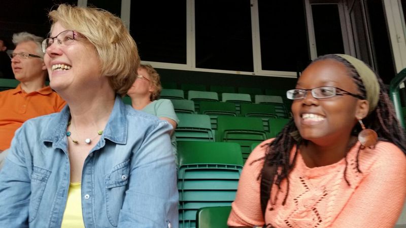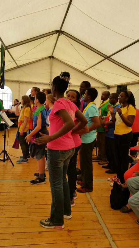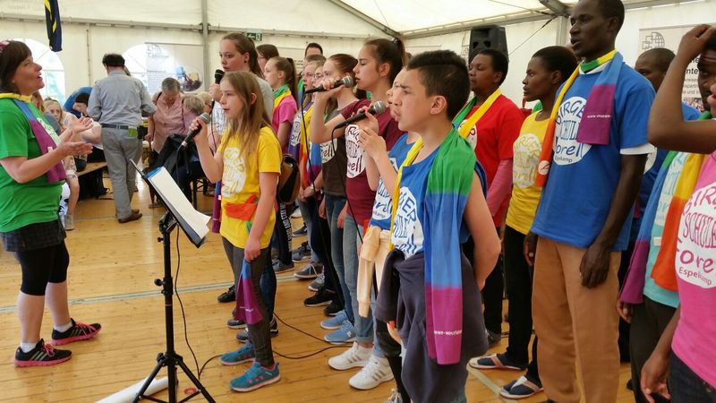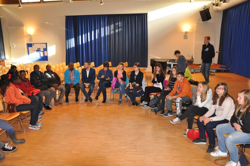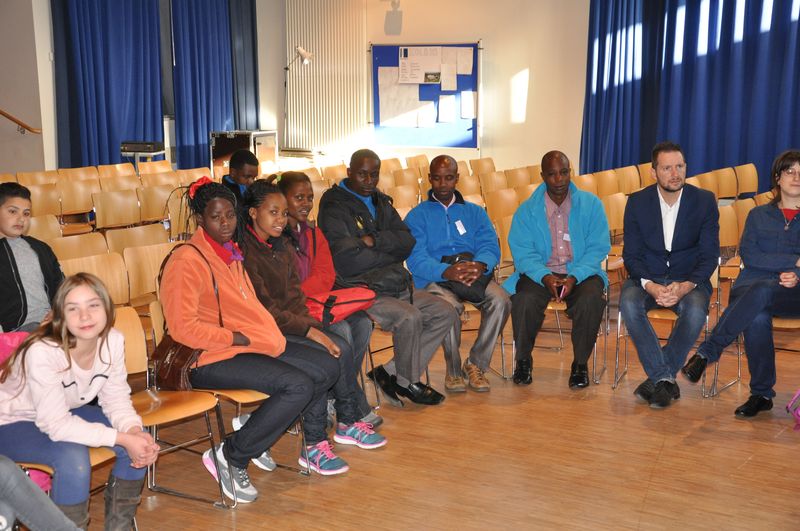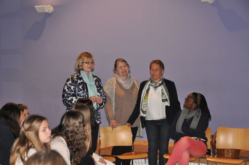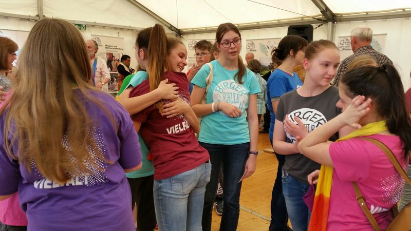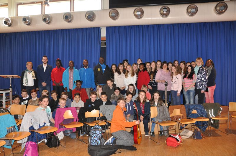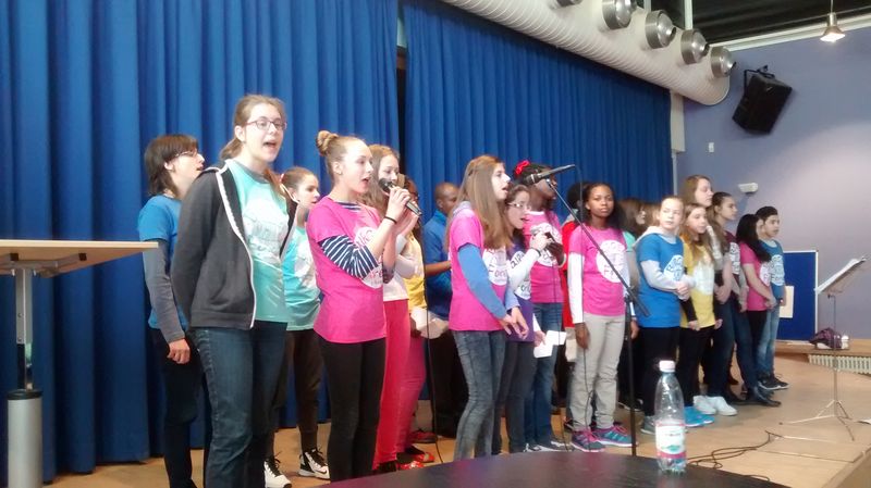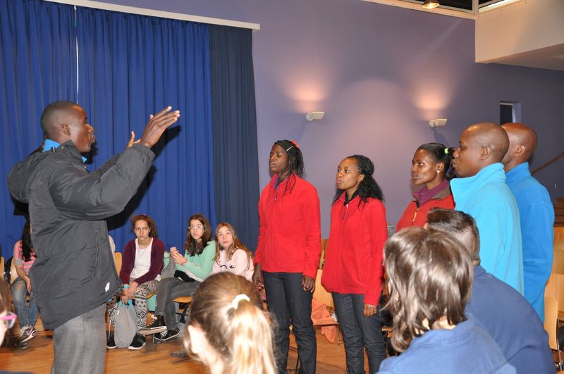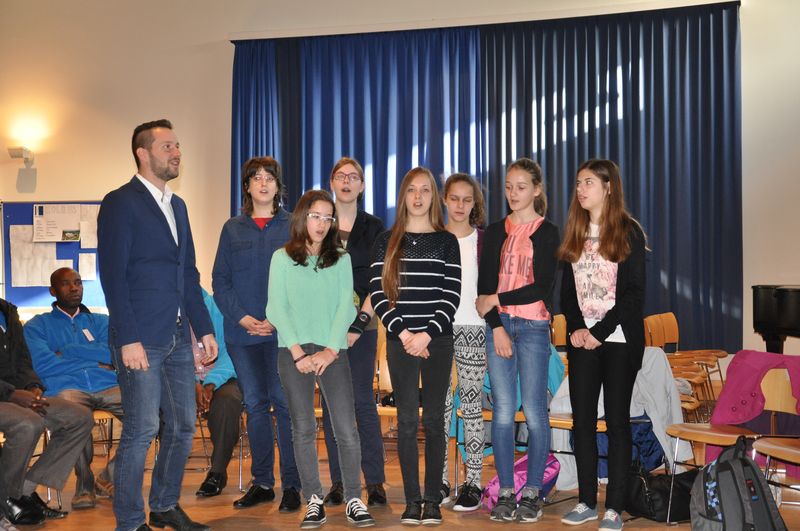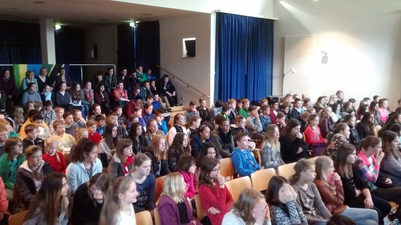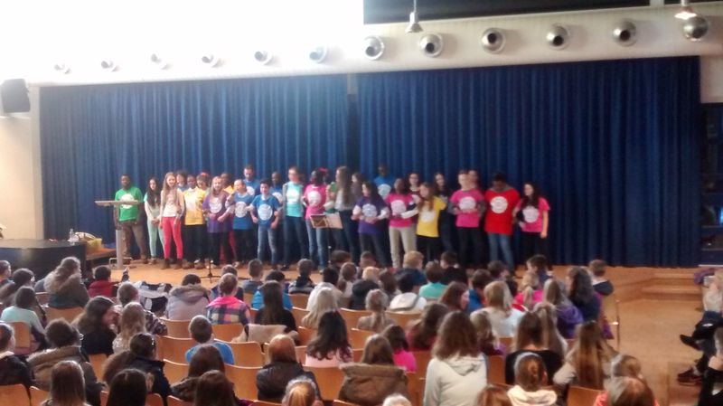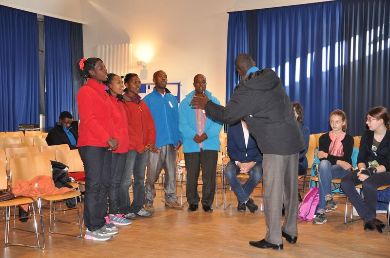 25.04.2016: Begrüßung der Gäste in der Schulaula und gemeinsames Singen; die beiden Schulleiterinnen Ursula Beinlich (BFS) und Christiane Kreft (BFR) hießen alle Gäste herzlich willkommen. Die drei Sängergruppen führten jeweils ein Lied aus ihrem Repertoire auf: die Sänger aus Tansania begeisterten mit dem wunderschönen Klang ihrer Stimmen, die Sänger aus Nagykörös standen dem in nichts nach, und der gemeinsame Chor unserer beiden Schulen zeigte ebenfalls, was er drauf hatte. Wunderschöne Lieder zum Wochenauftakt und zum Beginn des gemeinsamen internationalen Chorprojektes.