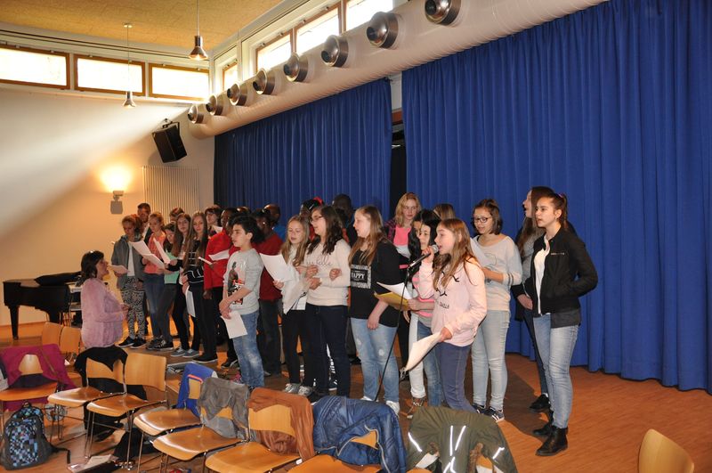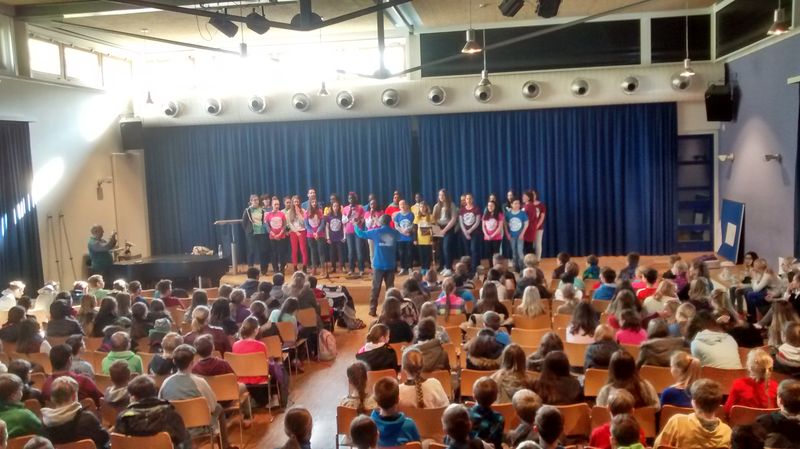 29.04.2016: Probe in der Aula vor Publikum für die anstehenden Auftritte; bemerkenswerte Qualität nach nur vier Tagen des gemeinsamen Probens, wenn man bedenkt, dass die Teilnehmer nebenher auch andere Aktivitäten wahrgenommen haben (siehe oben).