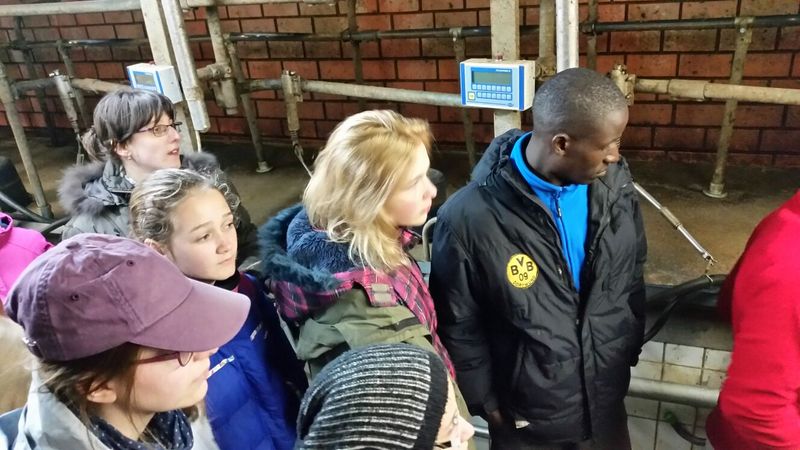 27.04.2016: Besuch des Bauernhofs Knost in Frotheim; vorher gab es in der Schule einen intensiven Austausch über Landwirtschaft in den drei Ländern Tansania, Ungarn und Deutschland. Die Führung über den Hof war für die Gäste sehr interessant, besonders im Bereich des Maschineneinsatzes. In Tansania wird fast nur mit der Hand gearbeitet. Ein besonderer Höhepunkt war die Besichtigung des Melkstandes.