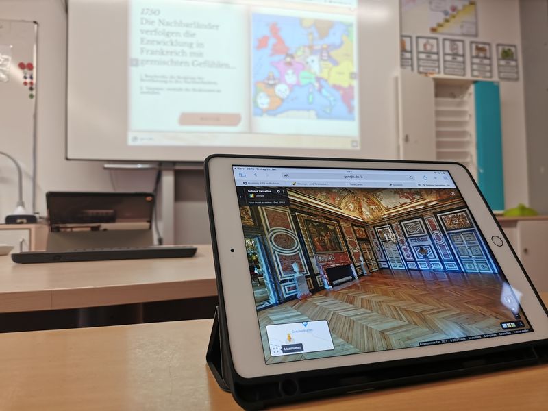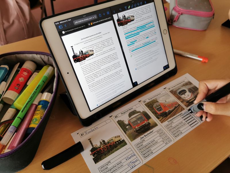 Das glaubt aus der Klasse niemand. Und das nicht nur, weil es ein offensichtlicher Aufhänger für die Klassenarbeit zum Thema „dialektisches Argumentieren“ ist. Ein Jahr lang haben die Schülerinnen und Schüler das iPad als digitales Hilfswerkzeug im Unterricht nutzen können und wissen nun genau, was zu tun ist. Um Punkt 8 Uhr verteilt sich die Klassenarbeit automatisch auf die Geräte und nur noch das leise Gleiten von Kunststoffspitzen über Glas ist zu hören.