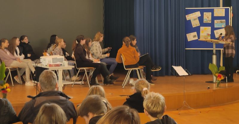 Der Jury, bestehend aus Schülerinnen aus den 8. und 10. Klassen und den Deutschlehrkräften des 6. Jahrgangs, fiel die Bewertung nicht leicht. Karin Wewers von der Stadtbücherei Espelkamp unterstützte sie dabei und schließlich stand die Platzierung fest.