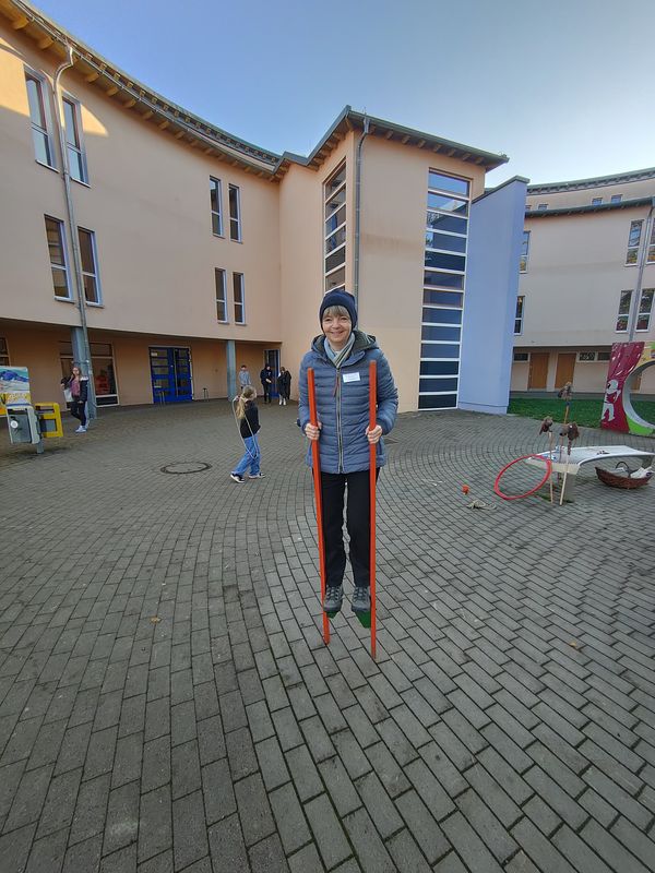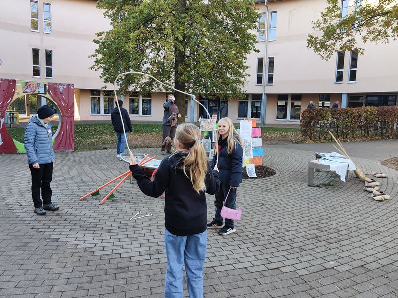 Danach wurden die Eltern mit ihren Kindern in Kleingruppen durch die Schule geführt. Die künftigen Schülerinnen und Schüler konnten sich an den vielen Mitmachstationen ausprobieren. Sie erlebten „Informatik zum Anfassen“ und konnten einen kleinen Song im Tonstudio komponieren. Spannendes bot die Station „Holz, Metall und mehr“, an welcher die Kinder sehen konnten, wie man einfache Bauteile erstellt und dann selbst handanlegen durften. Des Weiteren konnten die Kinder Kunstwerke der Schülerinnen und Schüler der Birger-Forell-Sekundarschule bestaunen und eigene kleine Kunstwerke kreieren. Die Schulküche lud mit vielen Leckereien zum Probieren ein. Auf dem Schulhof absolvierten die Schülerinnen und Schüler der 4. Klassen einen Biparcours, indem sie Fährten suchten und mit den iPads Informationen zu den Tierstimmen und der Lebensweise des jeweiligen Tieres finden konnten. Ein weiteres Highlight auf dem Schulhof war die Station der AG „Kunst, Kultur und Geschichte“, die zum Mitmachen bei Spielen, die vor hundert Jahren gespielt wurden, einlud. Die Schülerinnen und Schüler aus der AG erklärten jedem Besucher genau, was man sich früher so alles hat einfallen lassen. Dabei stellten Kinder und Eltern beim Stelzenlaufen, Sackhüpfen oder Eierlaufen ihr Können unter Beweis. Mathespiele lockten im Raum der Klasse 5d, im Foyer stellten sich die Schulsanitäter vor und in der Schulbücherei konnten die Kinder unter dem Motto „Book Tasting“ ihrem ganz individuellen Lesegeschmack frönen und bekamen einen Einblick in die Fremdsprachen. Die Räume des Kraftwerks, der Schulsozialarbeit und der naturwissenschaftlichen Sammlungen standen den Besucherinnen und Besuchern ebenso offen wie der Spieleraum und die Sporthalle.