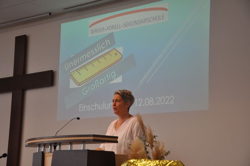 Schulleiterin Anja Buhrmann begrüßte alle Anwesenden mit einem herzlichen Willkommen. „Ich freue mich“, sagte sie, „mit euch und euren Eltern die nächsten sechs Jahre Schule zu gestalten.“ Sie bedankte sich bei allen Mitwirkenden des Einschulungsgottesdienstes für das umfangreiche Engagement. Die Einschulung sei ein besonderer Tag. Gemäß dem Thema der Andacht betonte sie, dass jeder Mensch unermesslich großartig sei. In dieser Weise pflege man an der Schule auch einen respektvollen Umgang miteinander. Abschließend wünschte Anja Buhrmann den neuen Schülerinnen und Schülern eine schöne Veranstaltung und ein gutes Ankommen an ihrer neuen Schule.