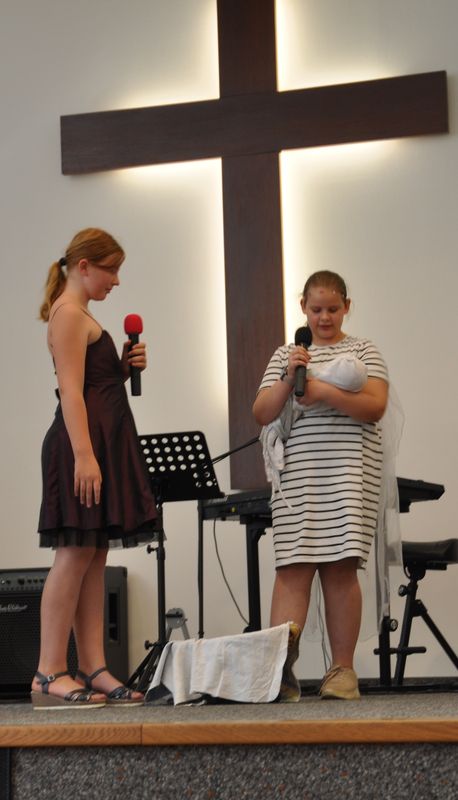 Schülerinnen und Schüler des sechsten Jahrgangs veranschaulichten das Thema „Gott beschützt und begleitet dich“ mit einem Rollenspiel von der Geschichte des Moses, den Gott beschützt, als er als Säugling in einem Weidenkorb auf einem Fluss ausgesetzt wurde.
