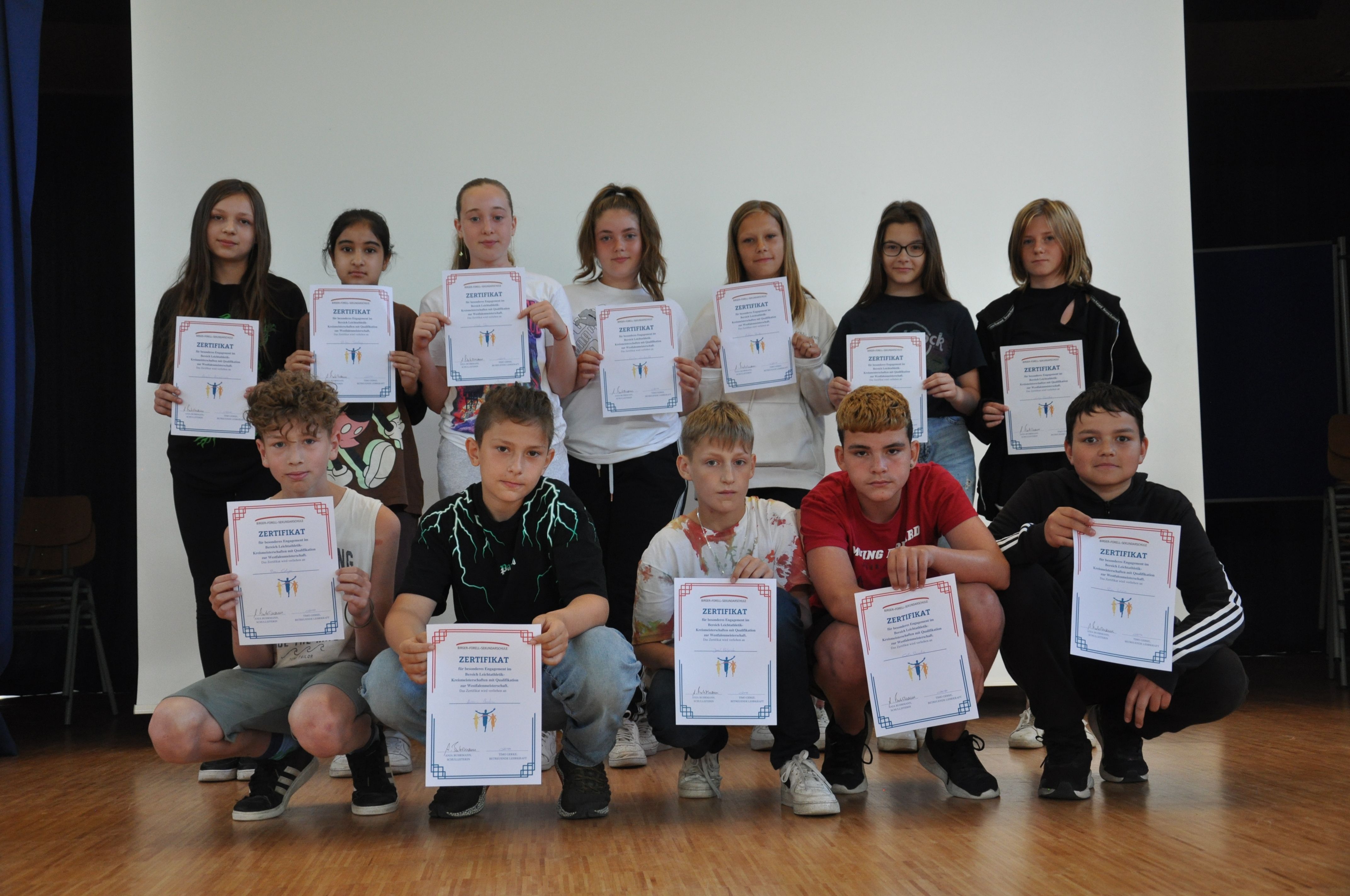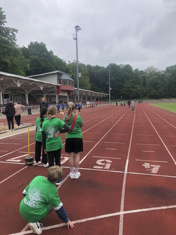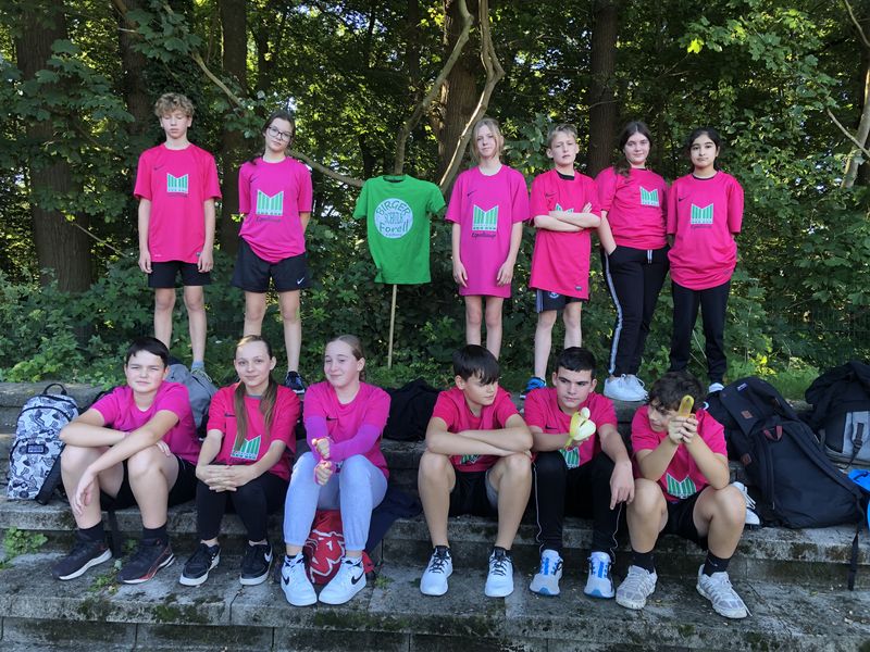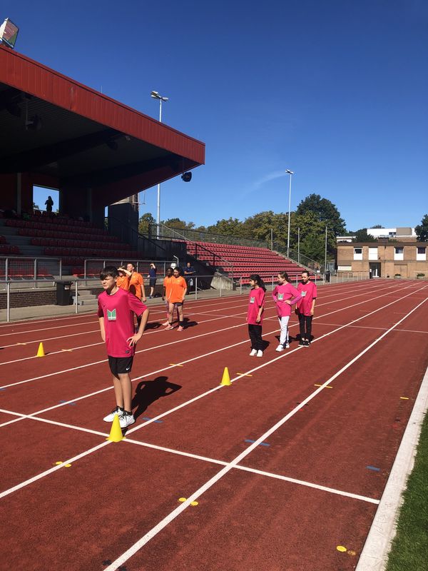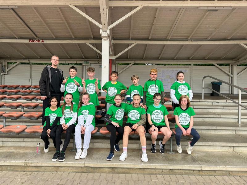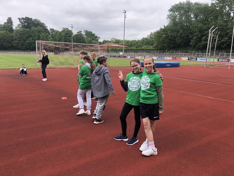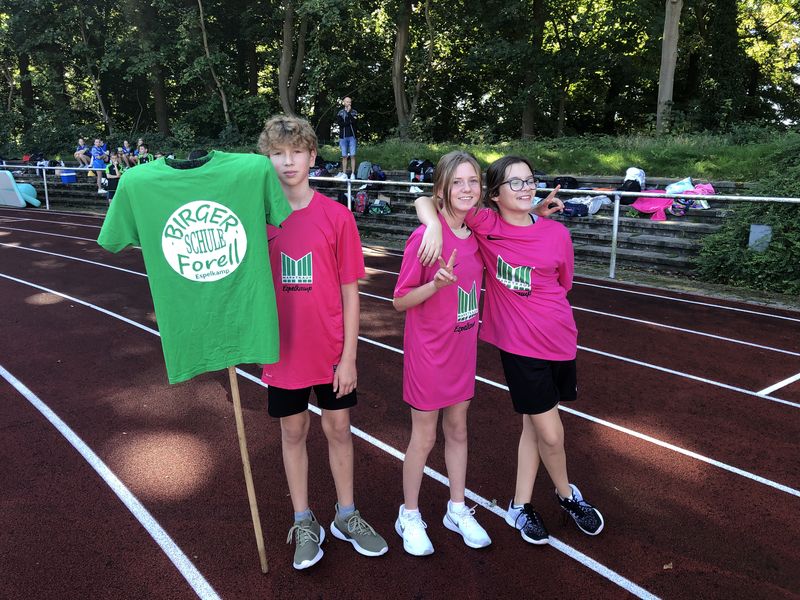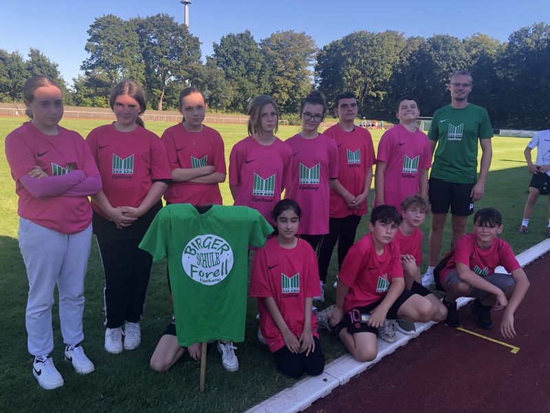 18.09.2023 (gerk) Am Dienstag, dem 5. September, trafen sich früh morgens 12 Schülerinnen und Schüler der Birger-Forell-Sekundarschule mit gepackten Sporttaschen am Busbahnhof Espelkamp und warteten auf den Reisebus, der sie mit drei weiteren Schulen aus dem Kreis Minden Lübbecke zum Westfalenfinale nach Rheine fuhr. Die Schülerinnen und Schüler hatten sich bei den Leichtathletik-Kreismeisterschaften in Minden für das Westfalenfinale qualifiziert und erwarteten hochmotiviert und voller Vorfreude den spannenden Tag. Nach rund zwei Stunden Fahrtzeit kam der Reisebus um 10 Uhr morgens und bei sonnigen 24 Grad am Jahnstadion in Rheine an. Die Athleten und Athletinnen mussten sich beeilen, weil der Wettkampf bereits kurze Zeit später losging. Also wurden schnell die Schultrikots übergezogen, einen schattigen Platz im Stadion gesucht und den Körper mit einem kurzen Aufwärmprogramm in Schwung gebracht. Anschließend wurde das Westfalenfinale feierlich eröffnet, indem jeweils zwei Schülerinnen und Schüler von den insgesamt 35 teilnehmenden Schulen bzw. Mannschaften mit selbsterstellten kreativen Schulschildern und bei einer Anmoderation ins Stadion einliefen. Die Frage, wer mit dem Schild der Birger Forell Sekundarschule einläuft, war schneller geklärt, als sie ausgesprochen werden konnte. Ben Ediger und Lucy Brocker riefen am schnellsten „Hier!“ und erhielten damit den Zuschlag.