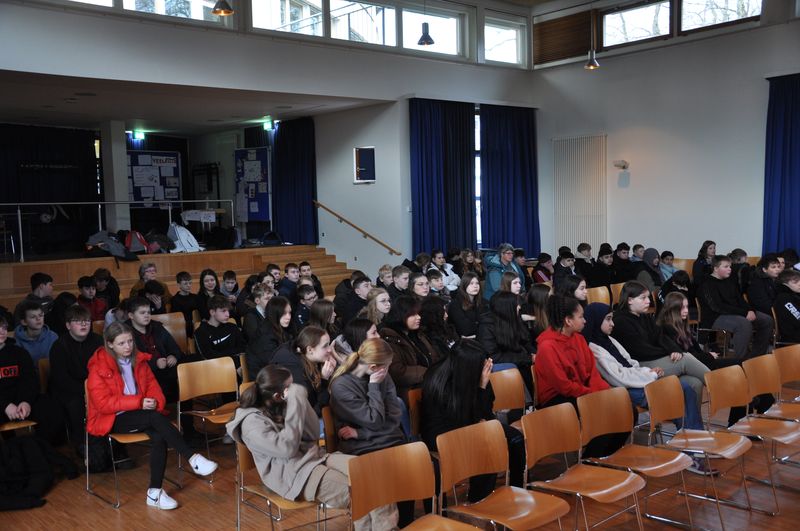 In der Andacht für die Jahrgangsstufen 5 und 6 ließen Christian Sümening und Niko Hass das tragische Schicksal von Anne Frank anschaulich lebendig werden. Dabei betonten die beiden Lehrer, dass es nicht entscheidend sei, an welche Religion man letztlich glaube. Im Mittelpunkt stünde der Mensch, der überall die gleichen Rechte habe. Vor allem das Recht auf Leben und Unversehrtheit, welches die Nationalsozialisten mit Füßen traten, gelte es aufrechtzuerhalten. „Wachen wir darüber, dass so etwas in Deutschland nie wieder passiert“, schloss Niko Hass seine anschaulichen Schilderungen. Viele Schülerinnen und Schüler stellten Fragen und lauschten den Erzählungen gespannt und aufmerksam.