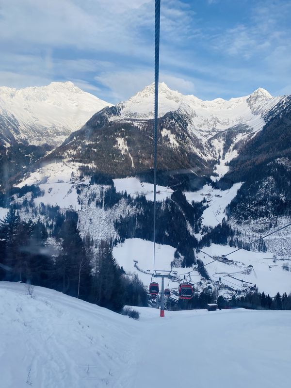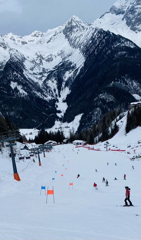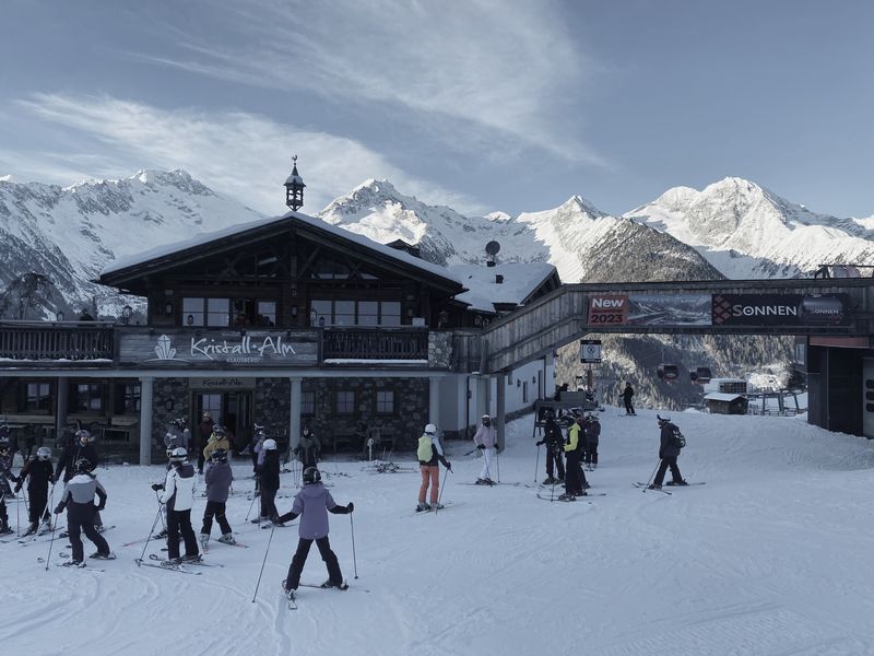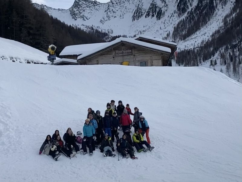 Am Montagmorgen ging es dann auf die Piste. Alle Teilnehmerinnen und Teilnehmer starteten gemeinsam im Klausi-Land mit den ersten Erfahrungen auf Skiern. Zunächst wurde gerollert und geskatet, gekantet und gekurvt. Dann kam die Gewichtsverlagerung auf den Talski dazu. Bereits am zweiten Tag konnten die Ersten anspruchsvollere Pisten erproben. Die Bedingungen dazu waren ideal, denn nachts war jede Menge Neuschnee gefallen. Unten hingegen wurde weiter intensiv geübt, sodass spätestens am vierten Tag fast alle Schülerinnen und Schüler die blauen und roten Pisten unsicher machen konnten. Zwei Skigruppen haben es sogar bis zum Gipfel auf 2510 m geschafft und konnten sämtliche Pisten, inklusive der beliebten Talabfahrt, erfolgreich meistern. Um sich zwischendurch zu stärken, gab es auf der Kristallalm die Hüttenklassiker wie Pommes, Spaghetti Bolognese und Kaiserschmarrn.