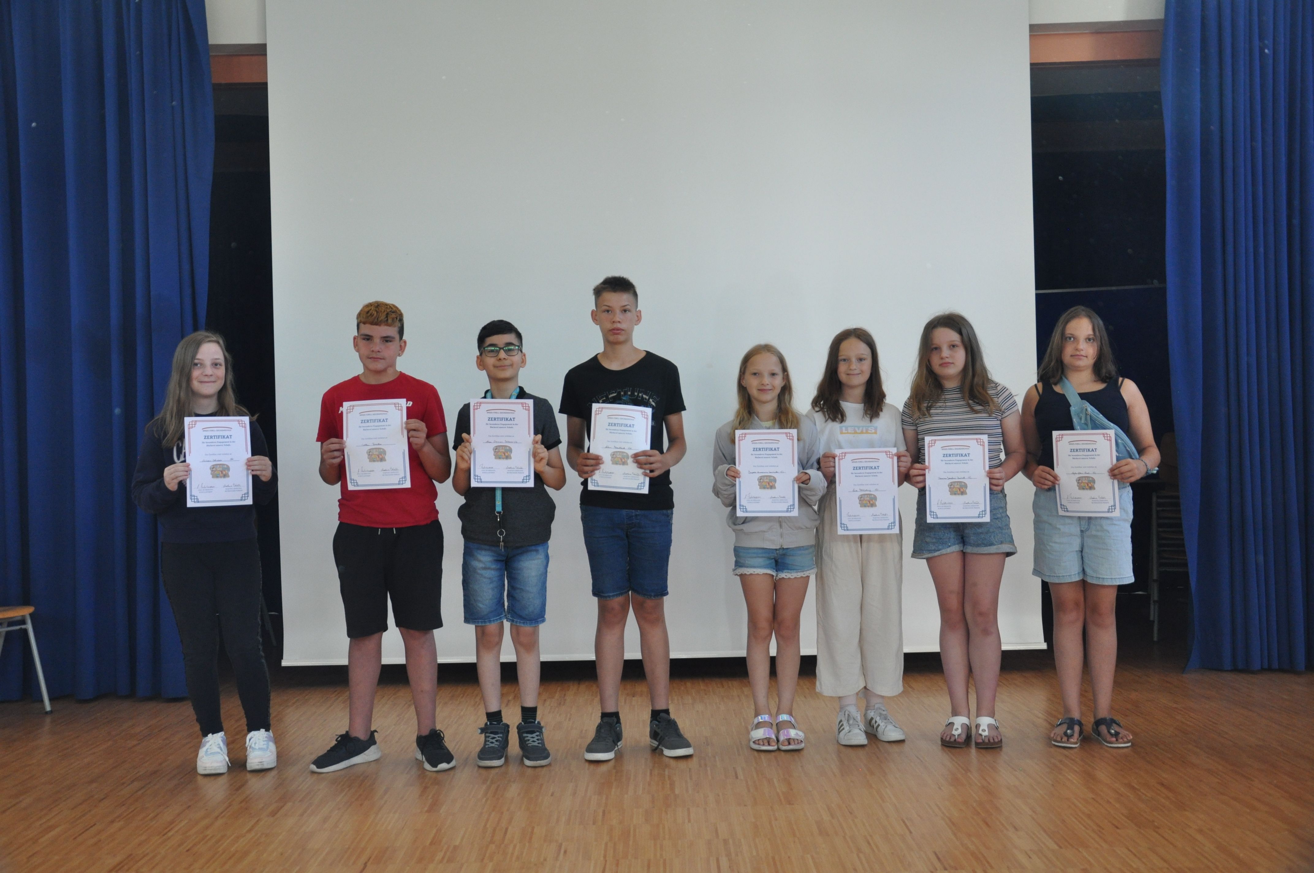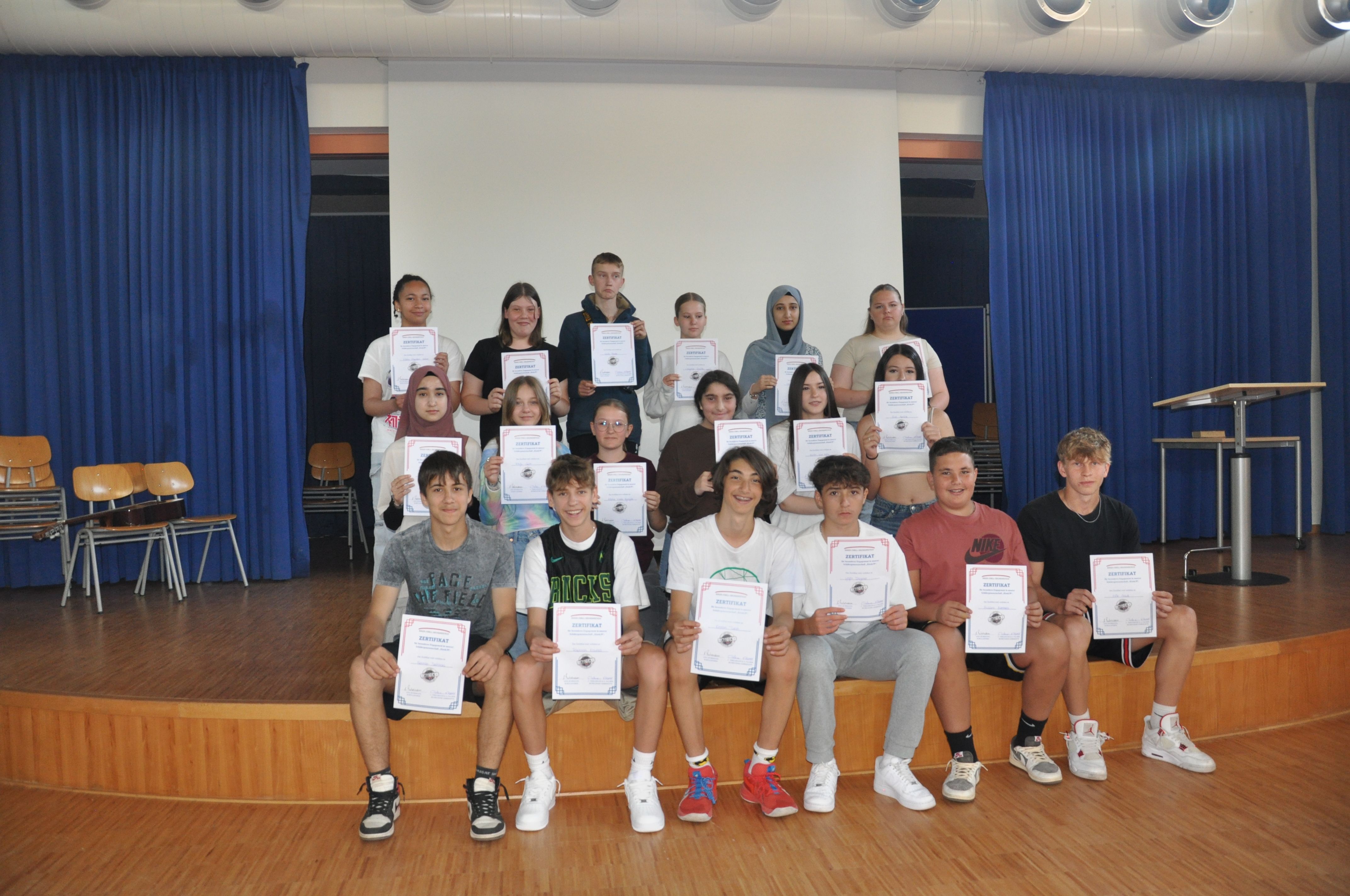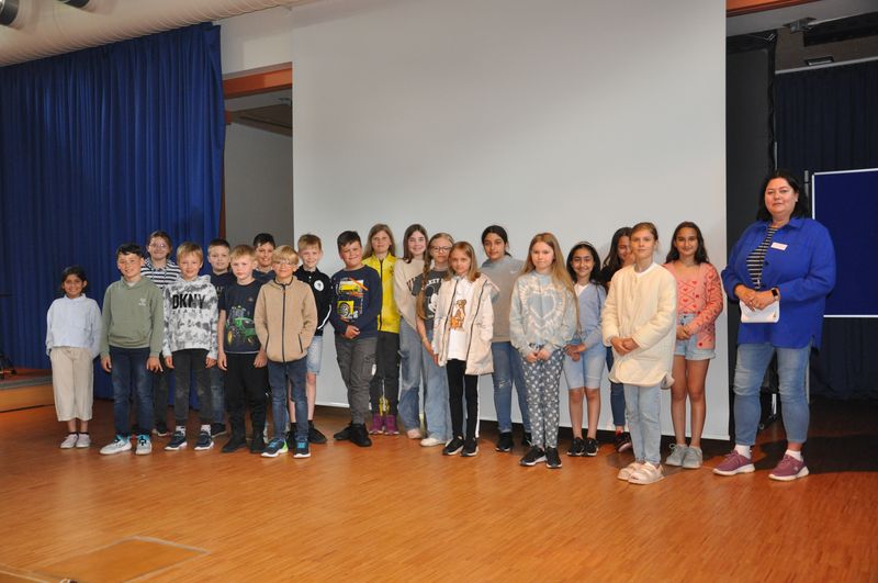 So versammelten sich am Donnerstag, dem 15. Juni 2023, alle Jahrgangsstufen in der Aula. Die Schülerinnen und Schüler, die sich in den schulischen Angeboten der Schule ganz besonders engagiert hatten, erhielten ein Zertifikat. Das betraf den besonderen Einsatz in der Schulbücherei, im Fach Mathematik (der ausgezeichnete Schüler hat am Unterricht in einer höheren Jahrgangsstufe erfolgreich teilgenommen), im Mathematikwettbewerb „Mathe-Pangea“, bei der Kreismeisterschaft in Leichtathletik, in der Schulband und im Bereich „Darstellen und Gestalten“, in der Matheolympiade, im Schulkiosk, für soziales Engagement, im Angebot „Glück“, bei den Denkmalpflegern und Museumsführerinnen, bei den Medien- und Lesescouts und bei den Sporthelfern. Eine ganze Reihe von Schülerinnen und Schülern aus den Jahrgangsstufen 5 bis 9 erhielten ihre Zertifikate aus den Händen von Schulleiterin Anja Buhrmann und den Lehrkräften, die die o.g. Angebote betreut haben. Dass der Schulleiterin diese Auszeichnungen eine Herzensangelegenheit sind, zeigte sie mit ihren, die Veranstaltung begleitenden Worten. Die Veranstaltung sei dazu da, „um euch danke zu sagen für euer Engagement in den unterschiedlichsten Bereichen“. So könnten die Schülerinnen und Schüler ihre Zertifikate, die „etwas ganz Besonderes“ seien, auch anderen zeigen, beispielsweise künftigen Arbeitgebern, wenn sie sich bewerben. Mit der Verleihung wolle man, so Buhrmann, aber nicht nur danken, sondern auch „Wertschätzung zeigen. Das ist auch eine Art von Respekt“, nämlich vor den besonderen Leistungen der Ausgezeichneten. Anja Buhrmann gratulierte den Geehrten herzlich. Viele Schülerinnen und Schüler erhielten ein oder mehrere Zertifikate für ihr Engagement in diesem Schuljahr. Die Schülerinnen und Schüler, die dieses Mal keine Auszeichnung erhalten hatten, ermunterte sie, die Möglichkeiten im nächsten Schuljahr zu nutzen und sich in einem der vielen Bereiche zu engagieren. Dies bereite den Schülerinnen und Schülern erfahrungsgemäß viel Freude, unterstützt sie in ihrer Entwicklung und würde ihnen am Ende des nächsten Schuljahres auch eine Ehrung mit einem Zertifikat ermöglichen.