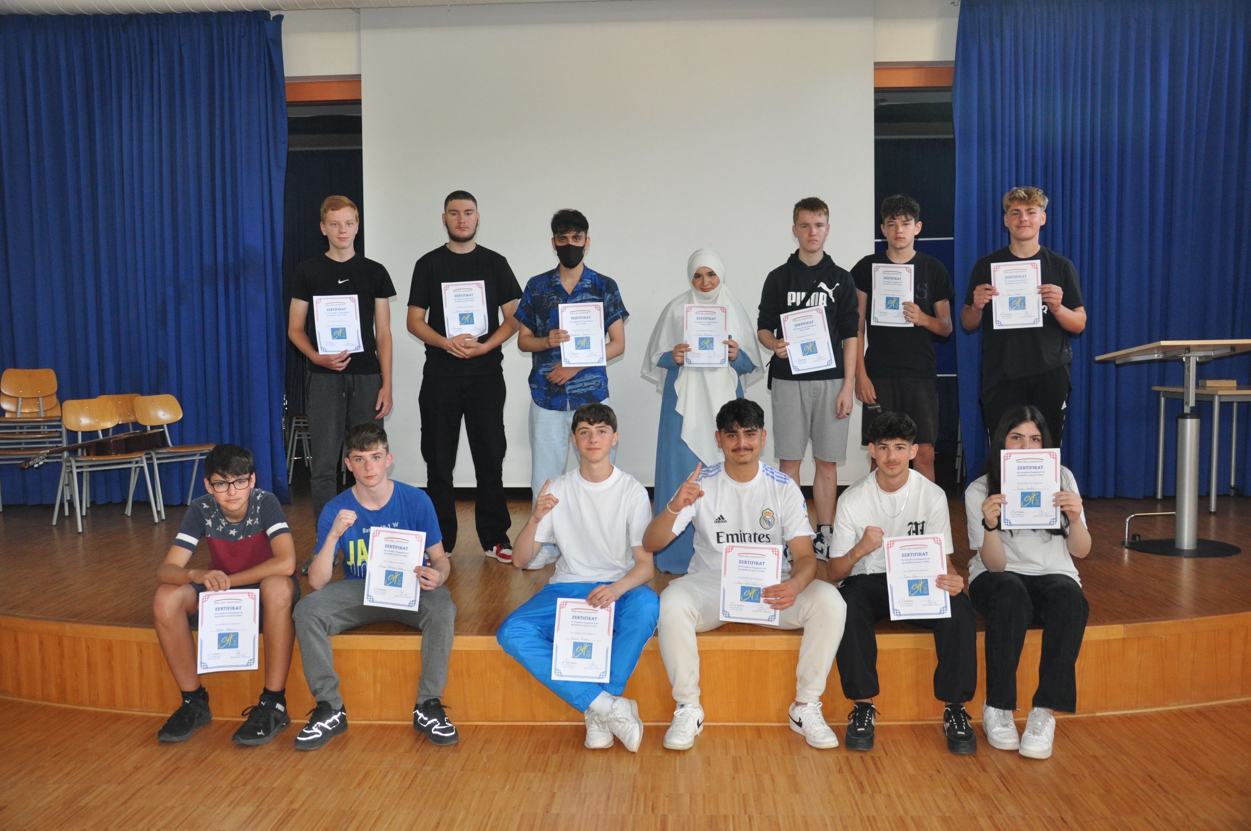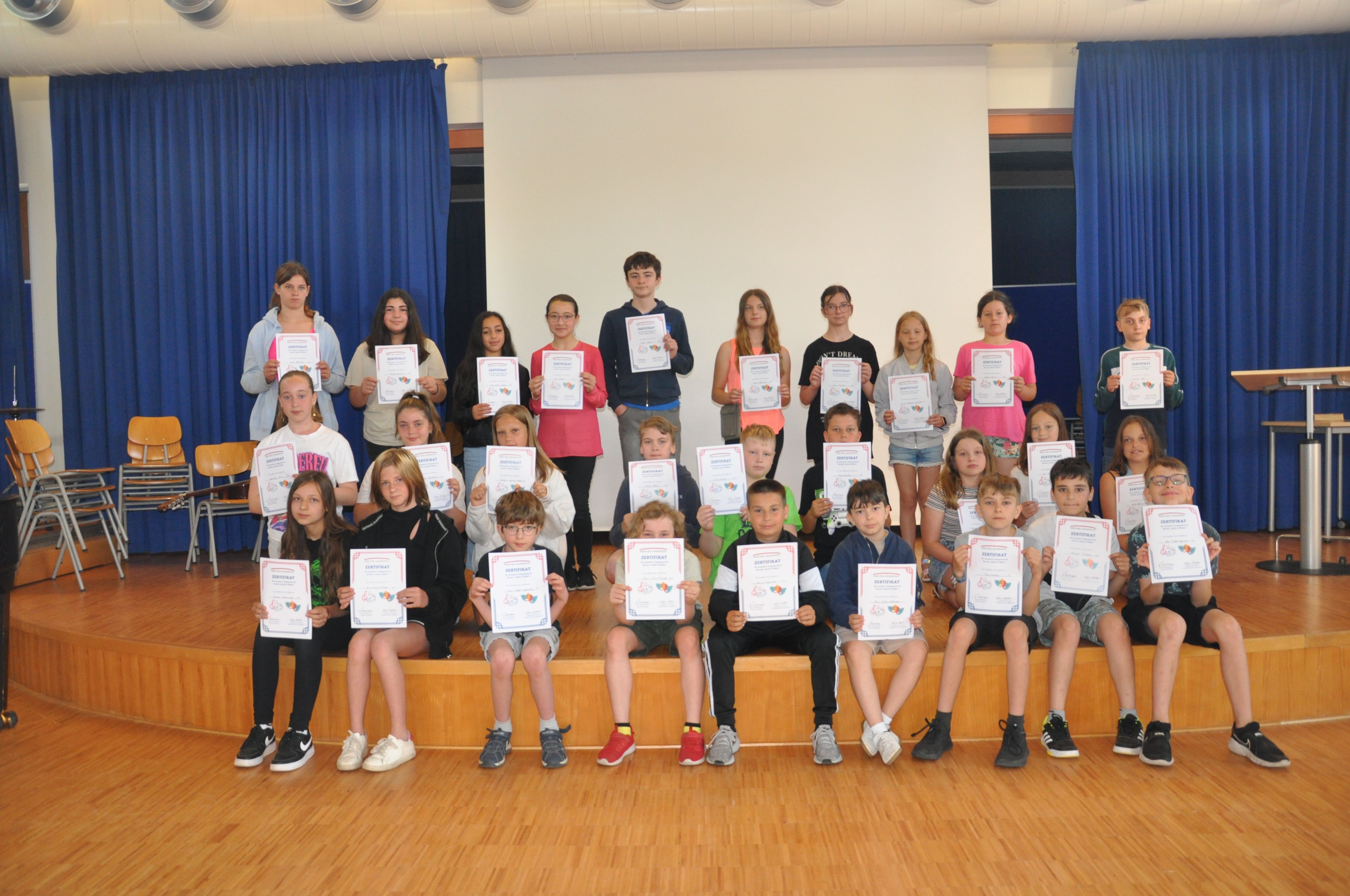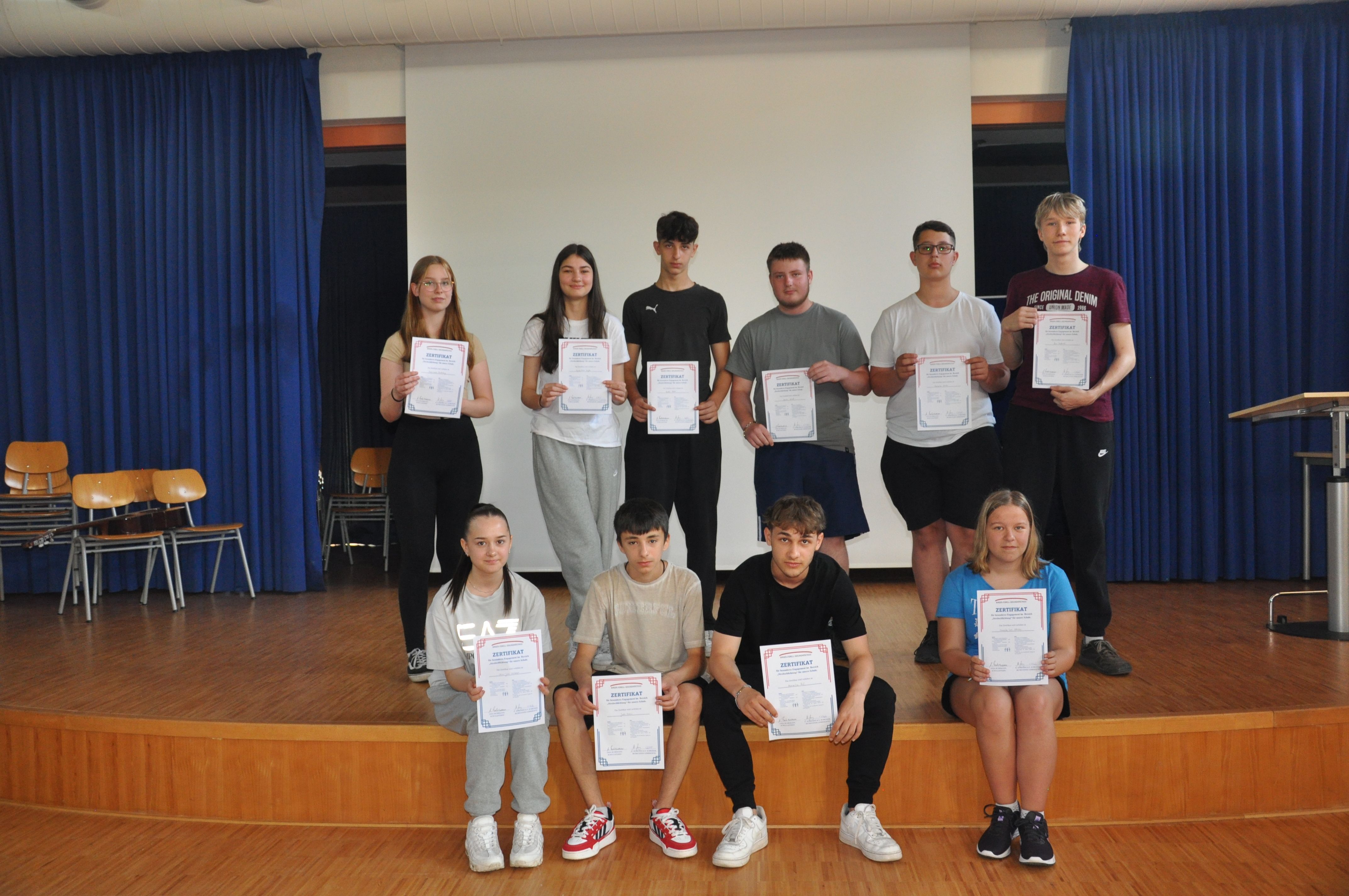 So versammelten sich am Donnerstag, dem 15. Juni 2023, alle Jahrgangsstufen in der Aula. Die Schülerinnen und Schüler, die sich in den schulischen Angeboten der Schule ganz besonders engagiert hatten, erhielten ein Zertifikat. Das betraf den besonderen Einsatz in der Schulbücherei, im Fach Mathematik (der ausgezeichnete Schüler hat am Unterricht in einer höheren Jahrgangsstufe erfolgreich teilgenommen), im Mathematikwettbewerb „Mathe-Pangea“, bei der Kreismeisterschaft in Leichtathletik, in der Schulband und im Bereich „Darstellen und Gestalten“, in der Matheolympiade, im Schulkiosk, für soziales Engagement, im Angebot „Glück“, bei den Denkmalpflegern und Museumsführerinnen, bei den Medien- und Lesescouts und bei den Sporthelfern. Eine ganze Reihe von Schülerinnen und Schülern aus den Jahrgangsstufen 5 bis 9 erhielten ihre Zertifikate aus den Händen von Schulleiterin Anja Buhrmann und den Lehrkräften, die die o.g. Angebote betreut haben. Dass der Schulleiterin diese Auszeichnungen eine Herzensangelegenheit sind, zeigte sie mit ihren, die Veranstaltung begleitenden Worten. Die Veranstaltung sei dazu da, „um euch danke zu sagen für euer Engagement in den unterschiedlichsten Bereichen“. So könnten die Schülerinnen und Schüler ihre Zertifikate, die „etwas ganz Besonderes“ seien, auch anderen zeigen, beispielsweise künftigen Arbeitgebern, wenn sie sich bewerben. Mit der Verleihung wolle man, so Buhrmann, aber nicht nur danken, sondern auch „Wertschätzung zeigen. Das ist auch eine Art von Respekt“, nämlich vor den besonderen Leistungen der Ausgezeichneten. Anja Buhrmann gratulierte den Geehrten herzlich. Viele Schülerinnen und Schüler erhielten ein oder mehrere Zertifikate für ihr Engagement in diesem Schuljahr. Die Schülerinnen und Schüler, die dieses Mal keine Auszeichnung erhalten hatten, ermunterte sie, die Möglichkeiten im nächsten Schuljahr zu nutzen und sich in einem der vielen Bereiche zu engagieren. Dies bereite den Schülerinnen und Schülern erfahrungsgemäß viel Freude, unterstützt sie in ihrer Entwicklung und würde ihnen am Ende des nächsten Schuljahres auch eine Ehrung mit einem Zertifikat ermöglichen.