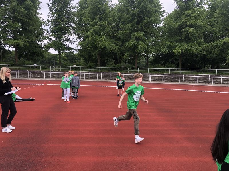 In einem vielseitigen Mannschaftswettkampf traten die Leichtathleten gegen vier weitere Teams an. Dazu gehörten zwei Teams des Mindener Sportgymnasiums (Besselgymnasium), ein Team der Freiherr-von-Vincke Realschule Minden und ein Team des benachbarten Söderblom-Gymnasiums. Bei perfektem Leichtathletik-Wetter absolvierten die genannten Teams im rotierenden Verfahren unterschiedliche Wettkämpfe aus den Bereichen Laufen, Springen und Werfen. Die Sekundar-Schülerinnen und Schüler mussten als erstes an die Heuler-Wurf-Station, bei der eine sogenannte Wurfrakete aus ein paar Metern Anlauf möglichst weit über das große Fußballtor geworfen werden musste. Der Ball landete in einer jeweiligen Zone und die Schülerinnen und Schüler sammelten somit fleißig Punkte. Zu den weiteren Stationen gehörte eine 50-Meter-Hindernis-Sprintstaffel, ein Zonenweitsprung, Hochsprung (Schersprung), Medizinballstoßen und zum Abschluss ein 8-Minuten-Ausdauerlauf. Bei allen Stationen stand nicht die individuelle Leistung im Fokus des Geschehens, sondern die Teamleistung. Nur im Team konnten die Schülerinnen und Schüler möglichst viele Punkte für ihre Schule sammeln, sodass sich die Leichtathleten bei jeder Station lautstark und mit viel Applaus anfeuerten. Für einen der obersten Platzierungen hat es an dem Tag leider nicht gereicht, aber die Schülerinnen und Schüler konnten sich trotzdem für das Westfalenfinale im September qualifizieren. „Dafür müssen wir dann im Sportunterricht mehr Leichtathletik machen“, betonte Raihan. In den letzten Wochen konnten die genannten Disziplinen nur selten geübt werden, weil für die Klasse 5a an diesem Tag auch noch eine Akrobatik-Aufführung für das 10-jährige Schulfest der Birger-Forell-Sekundarschule anstand, die aber trotz einiger erschöpfter Athleten mit Bravour gemeistert wurde.
