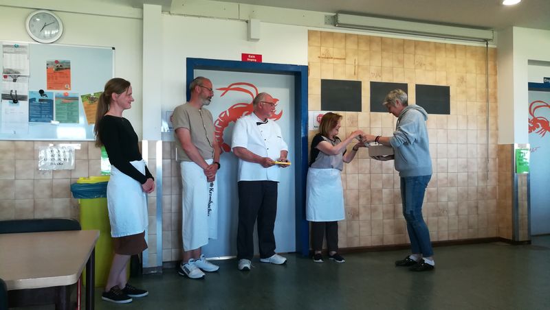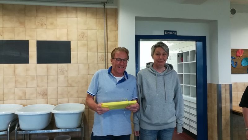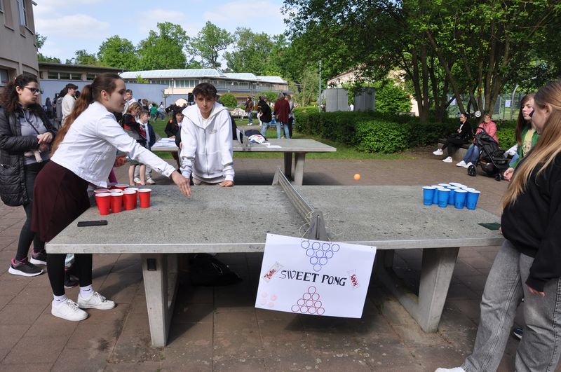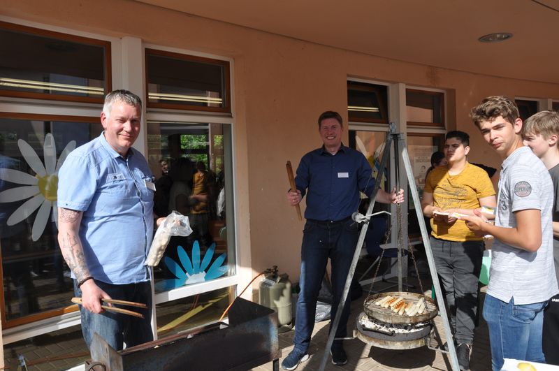 Wen bei all dem bunten Treiben der Hunger überfiel, der konnte sich am Schwenkgrill neben der Cafeteria eine leckere Wurst holen oder sich in der Cafeteria bei Kaffee und Kuchen erholen. Die Schülergenossenschaft und der Förderverein sorgten sehr engagiert für das leibliche Wohl. Viele Eltern hatten hier Kuchen und vieles mehr gespendet, damit das Schulfest auch ein Gaumenfest war.