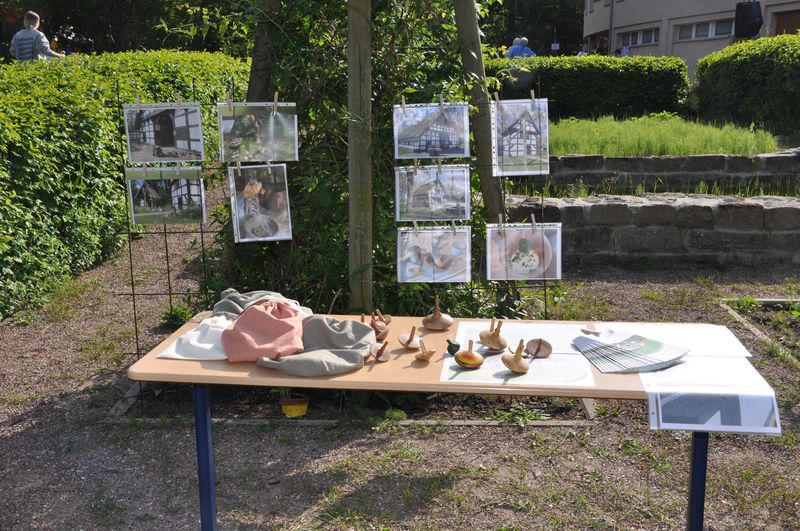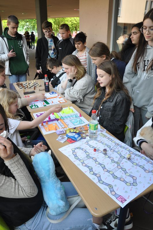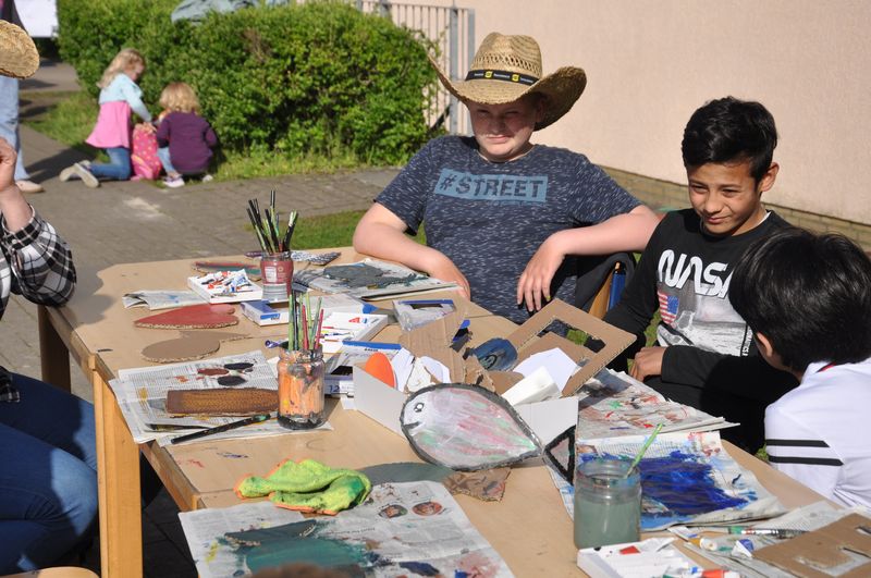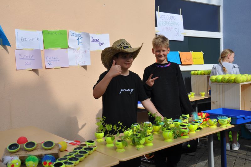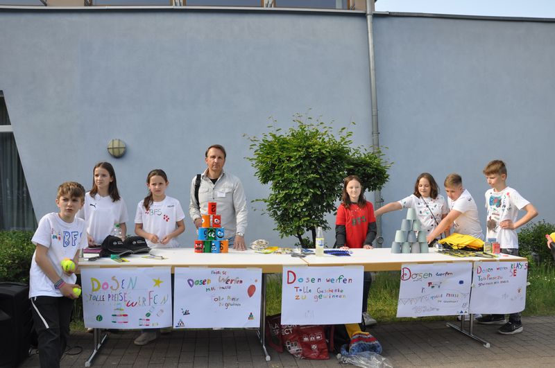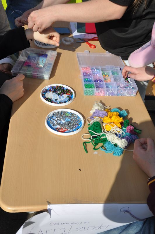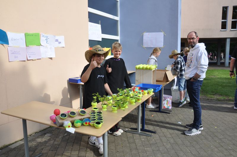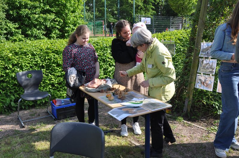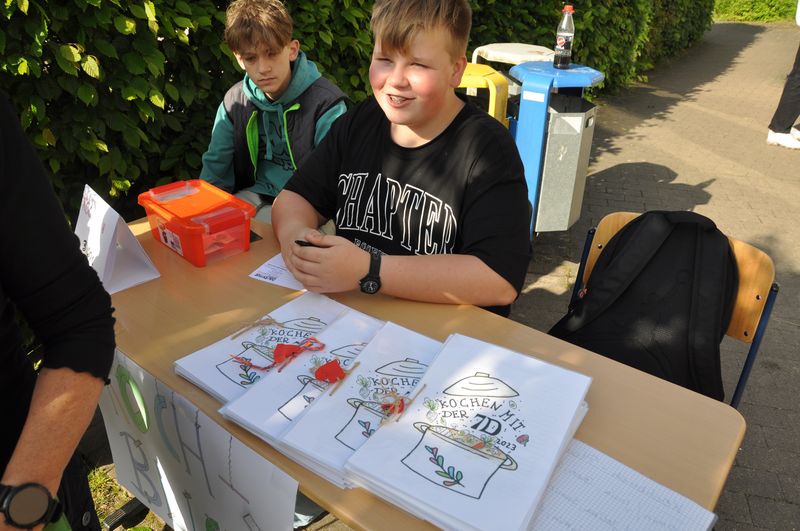 Auf dem Schulgelände konnten die Gäste viele Stationen zum Mitmachen, Stände mit kleinen informativen Ausstellungen und mit actiongeladenen Spielen besuchen. Eine große Hüpfburg für die kleinen Gäste war auf dem Tartanplatz aufgestellt. Der bereits erwähnte Schulgarten zeigte Wissenswertes über Pflanzen, Tiere und seltene Insekten. Ida, Lennard und Fynn erklärten den Besuchern viele interessante Einzelheiten darüber. An anderen Ständen hatten die Schülerinnen und Schüler Nachhaltigkeit zum Thema ihrer Präsentationen gemacht. Sie verdeutlichten die Wasserproblematik an der Partnerschule in Tansania und erklärten, wie man nachhaltiger leben und produzieren kann. Das Klimaschutzprojekt hatte sich der Müllproblematik angenommen und stellte Mülleimer aus wiederverwertbarem Karton her, um zu zeigen, wie man Plastik einsparen oder auch weitgehend ohne Plastik leben kann. Es gab selbstgezüchtete Pflanzen in kleinen Töpfen und zweckentfremdeten Tennisbällen zu bestaunen. Wer herausfinden wollte, wie gut er die Schule und ihre Gebäude kannte, konnte sich am „BFS-Guesser“ versuchen, einer Software, mit der man Fotos einzelner Bereiche der Schule ansehen und dann auf dem Lageplan anklicken konnte, an welcher Stelle der Schule sich der abgebildete Ort befindet. Selbst hergestellte bunte Fische aus Karton und gedrechselte Holzkreisel waren zu bestaunen, und auch das traditionelle Dosenwerfen gehörte dazu. Darüber hinaus konnten die Gäste sich an Brettspielen versuchen, die eine Klasse in Eigenarbeit hergestellt und teilweise sich ausgedacht hatte. Ihr Spielestand war beinahe die ganze Zeit dicht umlagert, denn die Spiele fanden großen Anklang. „Cool, mal was Neues. Die haben sich ja echt Mühe gemacht“, meinte ein Besucher bewundernd. An einem anderen Stand konnte man sich Armbänder und Halsketten selbst herstellen. Dazu musste man einen Wollfaden nehmen und bunte Perlen aller Art auffädeln. Ein paar Tische weiter lagen selbstgemachte Kochbücher mit erlesenen Rezepten zum Kauf bereit. Bereits ein Blick hinein ließ das Wasser im Mund zusammenlaufen. An Stellwänden konnten Geschichtsinteressierte etwas über die Varusschlacht und das Museum in Kalkriese erfahren. Schülerinnen und Schüler des siebenten Jahrgangs hatten dort ihre Forschungsergebnisse zusammengetragen, die sie während der Vorbereitungstage im Museum gesammelt hatten.