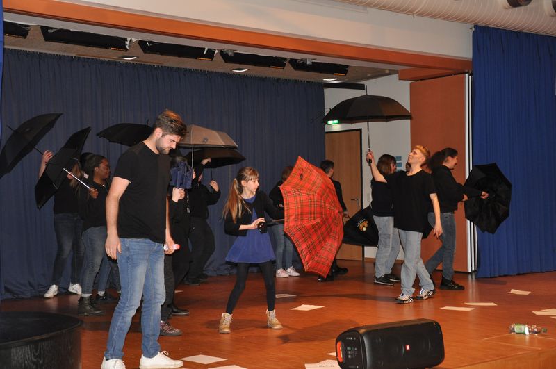 Die Bereiche Rap und Tanz/Theater nahmen den Hauptteil der Werkschau ein. Die Rapper machten den Auftakt und zeigten dabei, was sie während der Projektwoche auf die Beine gestellt hatten. Ihr erster Rap „Gänsehaut“ thematisierte die Themen Kriminalität und Mobbing. Mit eingängigen Versen und auf den Punkt gebrachten Slogans wiesen sie Möglichkeiten auf, wie man verhindern könne, dass Menschen auf die schiefe Bahn geraten oder Opfer psychischer Gewalt werden. Die Texte gingen teilweise enorm unter die Haut. Gleich im Anschluss kamen in einem Making-of des Gesamtprojektes, das per Video gezeigt wurde, die Schülerinnen und Schüler zu Wort. Sie berichteten von ihren Erfahrungen während des Erarbeitens ihrer Texte, ihrer Theatersequenzen und ihrer Choreographie. Sie hoben hervor, dass ihre Projektgruppen das eigene Zutrauen und die eigene Kreativität gesteigert hätten. Auch zeigten sie sich stolz, gemeinsam etwas erreicht zu haben. Das Making-of drehten sie selbst unter der Leitung von Ernst Meglin, Dozent an der Rapschool NRW. Der Videosequenz folgte ein zweiter Rap, in dem es um Hobbys und Ziele ging. Dabei spielte das Bild des Bogenschützen, der versucht, 720 Punkte zu erreichen, eine zentrale Rolle. Daher trug der Rap den Titel „Sieben, zwei, null“. Die Leitung hatte wie letztes Jahr Daniel Schneider von der Rapschool NRW. Er hatte wieder eine mitreißende Truppe am Start.