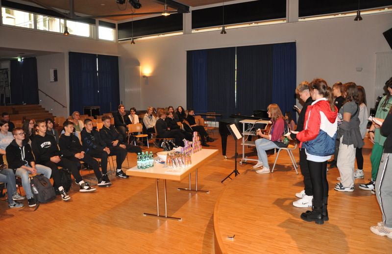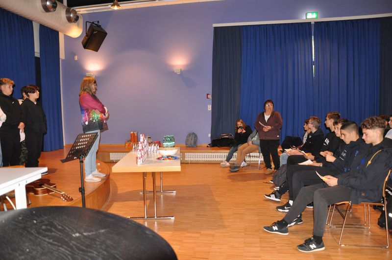 16.02.2023 Nach dem Ende der Coronapandemie konnte der alljährliche Gedenktag zur Befreiung des Konzentrationslagers Auschwitz an der Birger-Forell-Sekundarschule wieder in Präsenz stattfinden. Am 27. Januar fand daher für jeden Jahrgang je eine Andacht in der Aula der Schule statt, die die Lehrkräfte Sabine Matthäus, Claudia Schröder, Christian Sümening und Niko Hass hielten.