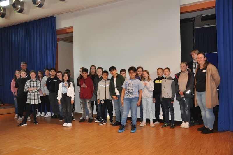Direkt im Anschluss versammelten sich die neuen fünften Klassen zusammen mit ihren Klassenlehrerinnen und Klassenlehrern für ein Gruppenfoto auf der Bühne, bevor sie in ihre Klassenräume gingen. Dort erhielten sie erste praktische Informationen für die kommenden Tage und stellten viele Fragen.