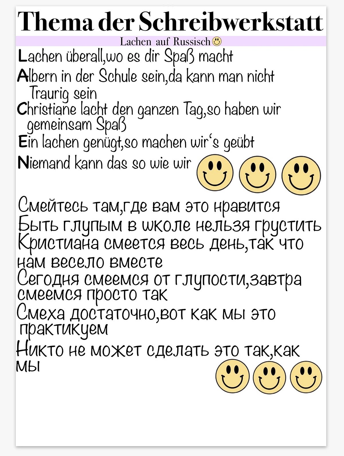 15.09.2023 (gerk) Was bringt mich zum Lachen? Einige mehrsprachige Lesescouts der Birger-Forell Sekundarschule nahmen dieses Thema der mehrsprachigen Schreibwerkstatt des Kreis Minden-Lübbecke zum Anlass, um eine eigene kurze Geschichte, ein Gedicht oder eine literarische Kurzform zu verfassen. Sie überlegten sich, was sie zum Lachen bringt. Sei es eine alltägliche Situation oder ein bestimmtes Ereignis, das schon länger zurückliegt.