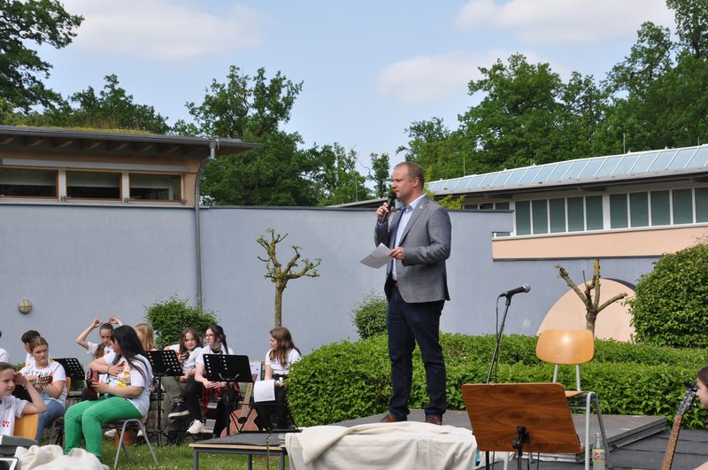 Anschließend richtete Bürgermeister Dr. Henning Vieker ein Grußwort an die Schulgemeinde. Er gratulierte herzlich zum Zehnjährigen und übermittelte die Glückwünsche von Rat, Verwaltung und Bürgerschaft der Stadt Espelkamp. „Wir alle sind wirklich glücklich über die großartige Entwicklung, die diese Schule in der letzten Dekade genommen hat.“ Auch er gab einen kurzen Rückblick und bezog dabei die ehemalige Realschule mit ein, die es seit 1960 in Espelkamp gab und aus der die Sekundarschule hervorgegangen ist. Die neue Schule übernahm den Namen Birger Forells und setzte damit das pädagogische Grundprofil fort, das heute deutlich erweitert ist, um die neuen Herausforderungen bewältigen zu können. Wichtig dabei sei, so Dr. Vieker, dass die Birger-Forell-Sekundarschule als eine Schule für alle firmiere. „Sie ist für alle da und ermöglicht allen den Zugang zu allen Perspektiven“, betonte Dr. Vieker. Das neue Konstrukt der Sekundarschule habe sich hier zu einem Erfolgsmodell entwickelt, ergänzte der Bürgermeister und schloss mit den Worten: „Die Birger-Forell-Sekundarschule ist in zehn Jahren zu einem Herzstück der Bildungsarbeit in Espelkamp geworden. Alle, die daran mitgewirkt haben, können stolz darauf sein. Und allen danke ich von Herzen für ihren engagierten Einsatz, besonders auch denen, die heute zu diesem rundum gelungenen Jubiläumsfest beitragen – auf, vor und hinter der Bühne.“