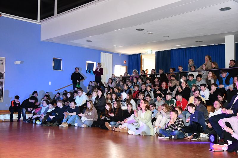 Die Schülerinnen und Schüler der 10. Klassen hörten im Rahmen einer Dokumentation dargestellte Erlebnisse von Zeitzeugen, die damals in oppositionellen Jugendgruppen wie der Swing-Jugend versuchten, sich der Bevormundung und Unterdrückung zu entziehen. Hier gab es viele Inhaftierungen, aber auch mutige Beispiele für ein Aufbegehren gegen den Terror des Hitler-Regimes. Die Dokumentation wurde durch kurze Erläuterungen von Christian Sümening ergänzt. In seinem Schlusswort plädierte Niko Hass in Erinnerung an den Holocaust für ein menschliches Miteinander. In einer Zeit vieler gesellschaftlicher und politischer Krisen sei es wichtig, Mensch zu bleiben. Sich für Freiheit, Individualität, Toleranz und Recht für alle einzusetzen, ermögliche ein friedliches Leben jetzt und in der Zukunft.