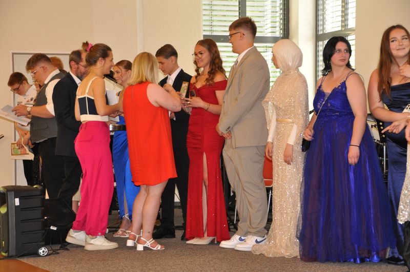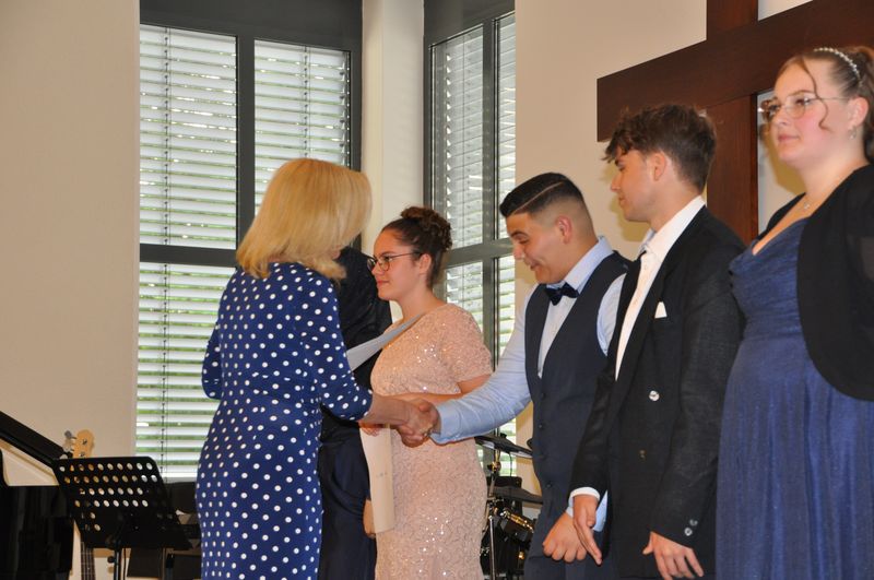Dieses Jahr haben 44 Prozent der Schülerinnen und Schüler die Fachoberschulreife mit Berechtigung zum Besuch einer gymnasialen Oberstufe (Q-Vermerk) erreicht, 28 Prozent erlangten den mittleren Schulabschluss der Fachoberschulreife und weitere 28 Prozent den Hauptschulabschluss nach Klasse 10 oder andere Abschlüsse. Darüber hinaus konnten, wie im letzten Jahr, etliche Schülerinnen und Schüler zusätzliche Auszeichnungen mit nach Hause nehmen. Für das Engagement und besonderen Einsatz in Bereichen außerhalb des Fachunterrichts sowie für den jahrelangen Einsatz in der Musikklasse 10c, die bei vielen Veranstaltungen aktiv war, erhielten die Schülerinnen und Schüler Zertifikate zur Anerkennung ihrer besonderen Leistungen.