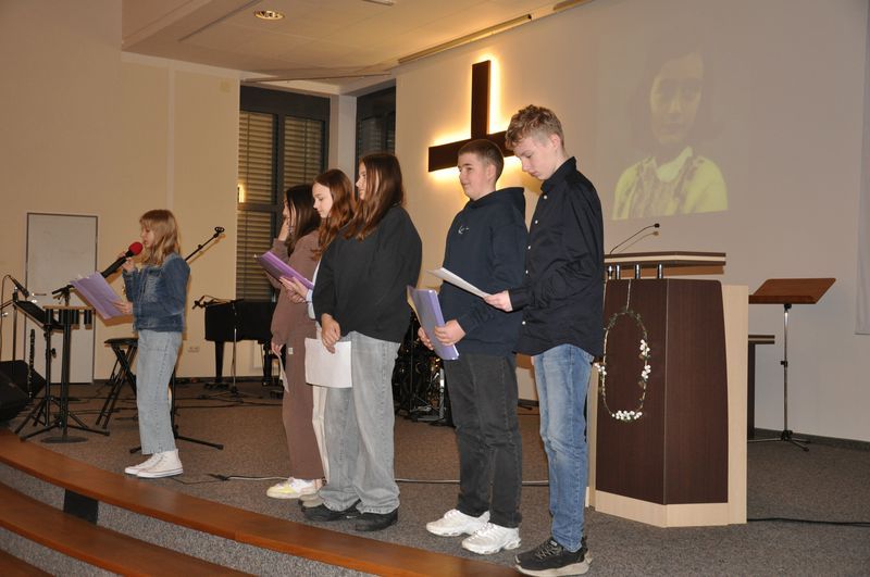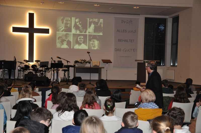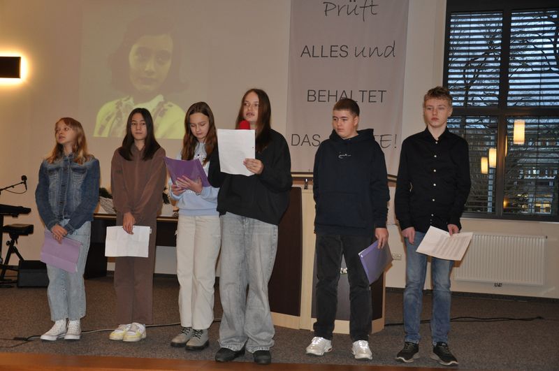 In der Andacht für die Jahrgangsstufe 5 berichtete Niko Hass über das Schicksal von Anne Frank. Die Schülerinnen und Schüler aus der 7c verlasen Textstellen aus Anne Franks Tagebuch und ließen Annes Denken und Fühlen lebendig werden. Dabei gewannen alle Anwesenden einen tiefen Einblick in die dunkle Zeit des Nationalsozialismus mit all seinen Verbrechen an der Menschlichkeit. Anne Frank hatte am fünfzehnten Juli 1944, kurz vor ihrer Verhaftung, in ihr Tagebuch geschrieben: „Wenn ich zum Himmel schaue, denke ich, dass sich alles wieder zum Guten wenden wird, dass auch diese Härte aufhören wird, dass wieder Ruhe und Frieden in die Weltordnung kommen werden.“ Anne Frank hat das nicht mehr erlebt. Sie starb im Februar 1945 im Lager Bergen-Belsen. Sie war Jüdin und deshalb verfolgt und umgebracht worden. Sie war ein Mensch, der nicht in das Welt- und Menschenbild der Nationalsozialisten passte. Man hatte ihr das Menschsein aberkannt. „Wir sind aber alle Menschen. Wir haben alle die gleichen Rechte“, betonte Niko Hass und gab seiner Hoffnung Ausdruck, dass das in Zukunft so bleibt.