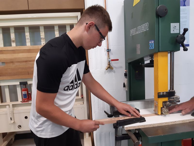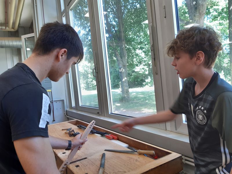 Nach dem Anzeichnen – Angaben in mm und nicht am Maßband die Inchseite nehmen – wurde gebohrt, geraspelt, gefeilt. Die Bandsäge meisterten die Jugendlichen problemlos und die zwei Teile der zukünftigen Zange waren das Ergebnis. Danach ging es an den Bandschleifer, die Kreissäge und erforderte ganz viel Schleifarbeit per Hand, und nach Verleimen und Verschrauben war es schließlich geschafft.