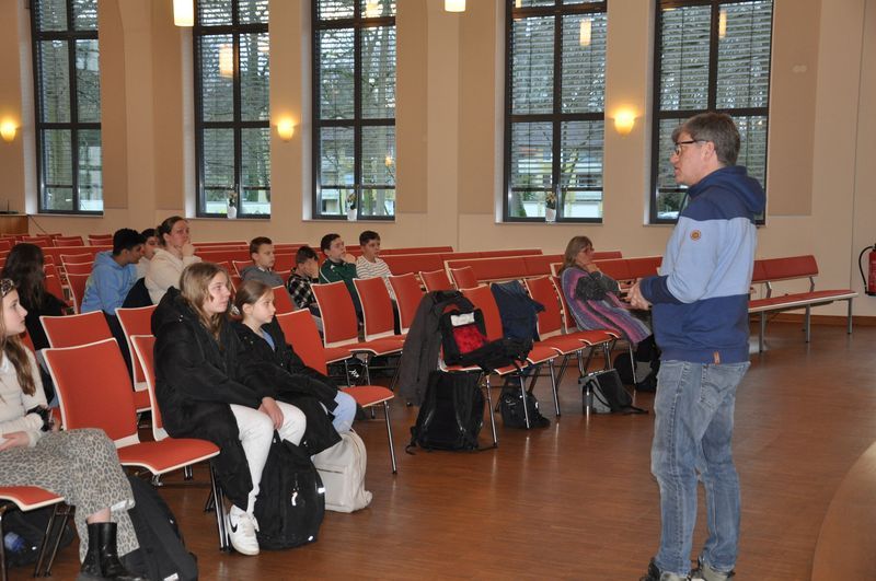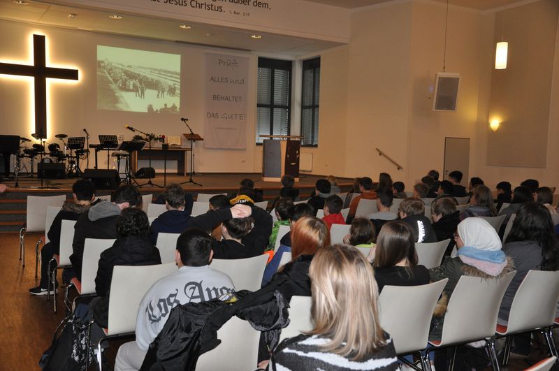 Anschaulich zeigten Bilder den 7. Klassen, wie die Vernichtung der Häftlinge im Lager Auschwitz-Birkenau ablief. Niko Hass schilderte die damaligen Ereignisse sehr lebendig, so dass etliche Schülerinnen und Schüler betroffen reagierten, dann aber auch interessiert nachfragten. Der Lehrer für Gesellschaftslehre legte dabei einen Fokus auf die Wachmannschaften des Lagers. Er zeigte, dass sie die Inhaftierten wie Schädlinge behandelten, die es auszurotten galt. Ein Foto von fröhlich singenden KZ-Aufsehern und Aufseherinnen entlarvte deren Zynismus gegenüber den Häftlingen.