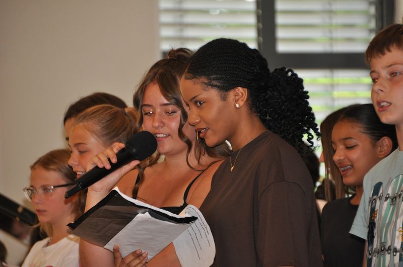 Die Aula der Schule war bis auf den letzten Platz gefüllt und der Besucherandrang sogar größer als erwartet, als die Musikklasse 5c unter der Leitung von Musiklehrerin Claudia Schröder den Nachmittag mit einem schwungvollen „He’s got the whole world in his hand“ eröffnete. Die Gäste applaudierten begeistert und waren sehr angetan von der Darbietung.