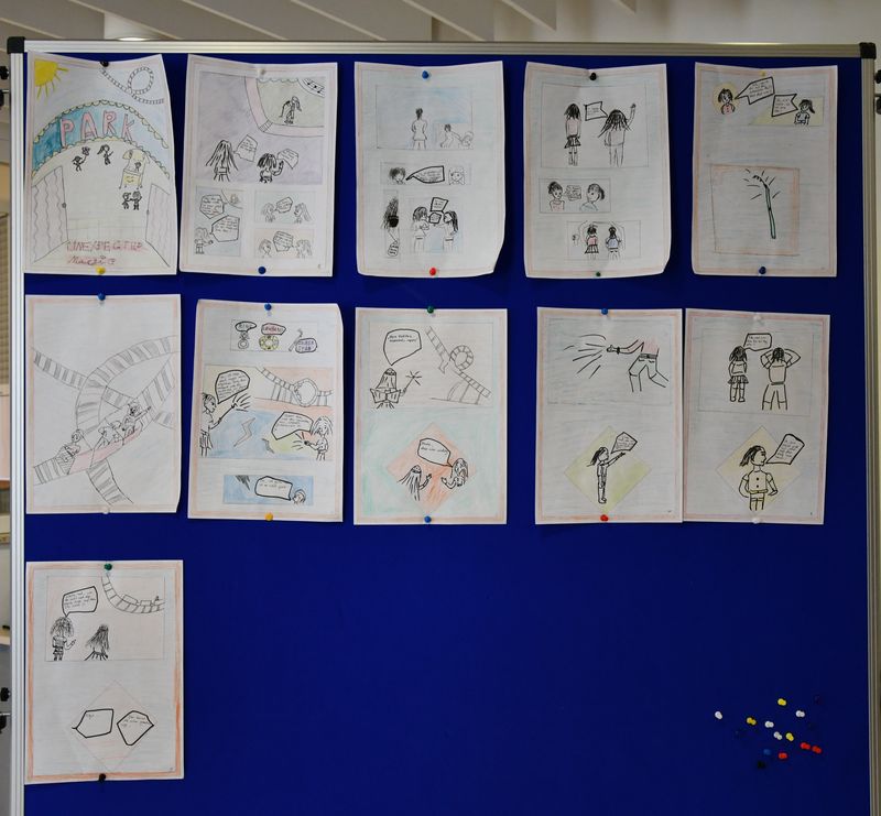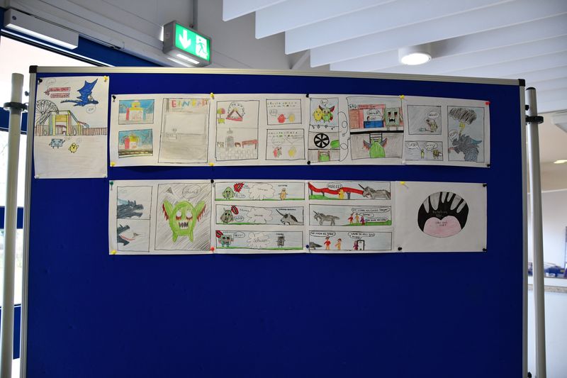 Vor der Aula hatte die Comic-Gruppe eine Ausstellung vorbereitet. Unter der Leitung von Monib Sadat, einem Streetart-Künstler bei der Rap School NRW, hatten die Schülerinnen und Schüler drei bunte Comics gezeichnet. Monsterparks, Zauberei und Space Ball nötigten den Betrachtern Respekt und Anerkennung ab. Die Comics zeigten viel Kreativität und Fantasie. In den entwickelten Storyboards kamen die unterschiedlichsten Charaktere vor. Ungewöhnliche Ideen und starke Emotionen hatten die Schülerinnen und Schüler handwerklich gut umgesetzt.