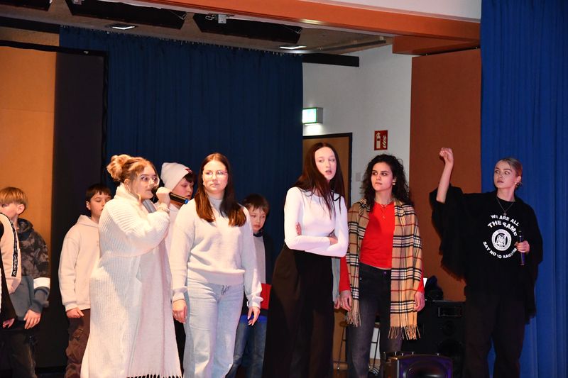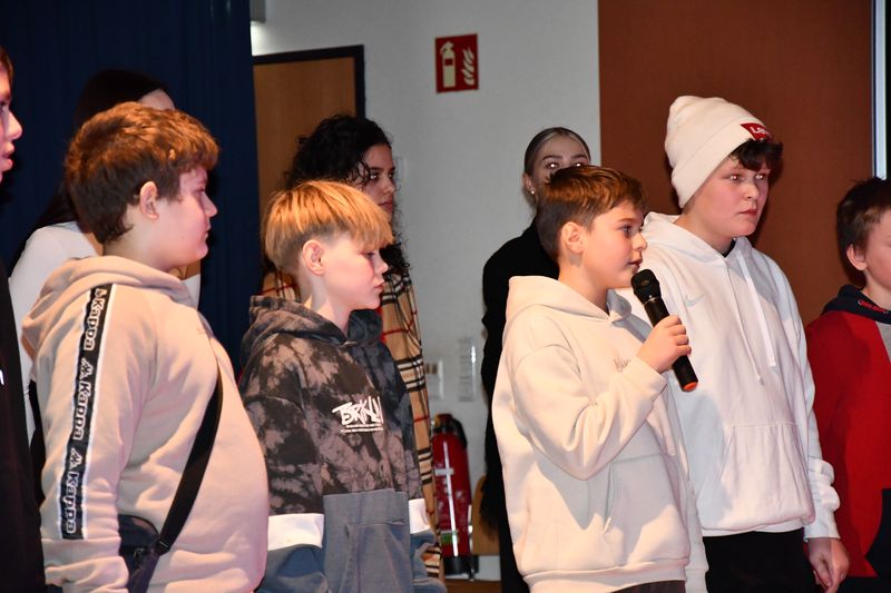 03.02.2025 Die Befreiung des Konzentrationslagers Auschwitz jährt sich dieses Jahr zum achtzigsten Mal. Anlässlich des Gedenktages lud die Birger-Forell-Sekundarschule alle Jahrgangsstufen zu Andachten ein. Die Andachten hielten die Lehrkräfte Sabine Matthäus, Christian Sümening und Niko Hass. Unterstützt wurden sie dabei von Jagoda Sarnecka, Meiqi Chen, Ayla Öcal, Lia Helpling, Fynn Doempke und Marcel Ergart aus der Klasse 7c. Musikalisch umrahmten Sabine Matthäus und Niko Hass das Programm mit „Imagine“ von John Lennon und dem jüdischen Lied „Dona, dona“. Beide Lieder passten gut zum Thema. „Imagine“ drückt die Hoffnung der Menschen aus, irgendwann miteinander in Frieden zu leben. „Dona, dona“, zu deutsch „Das Kälbchen“, geschrieben von Jizchak Katzenelson, beschreibt, wie ein junges Kalb zur Schlachtbank geführt wird. Damit spielt es auf den Transport der jüdischen Häftlinge in die Lager an.